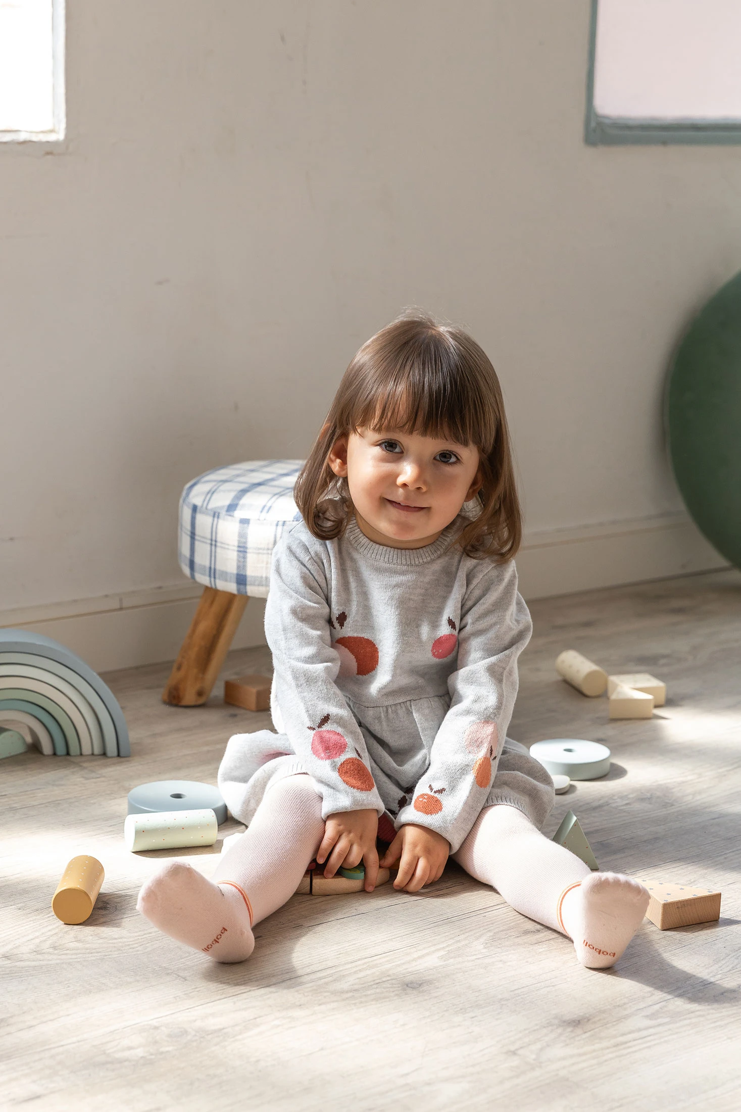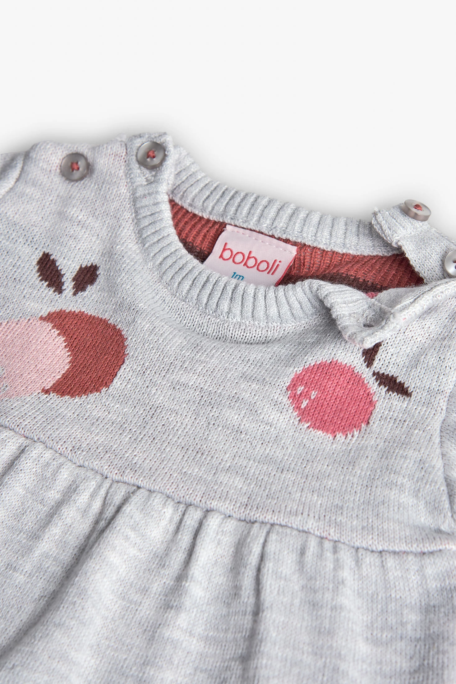 Robe en tricot pour bébé en couleur écrue, confectionnée en tricot doux pour offrir chaleur et confort pendant les mois d'automne et d'hiver. Elle arbore un charmant design de fruits aux couleurs vives, qui ajoute une touche ludique et unique à la garde-robe infantile. Une fermeture pratique avec des boutons à l'épaule facilite son habillage et son retrait. Disponible en tailles de 1 mois à 24 mois, elle est idéale pour être associée à des collants ou des chaussettes et garder votre bébé au chaud et tendance.
