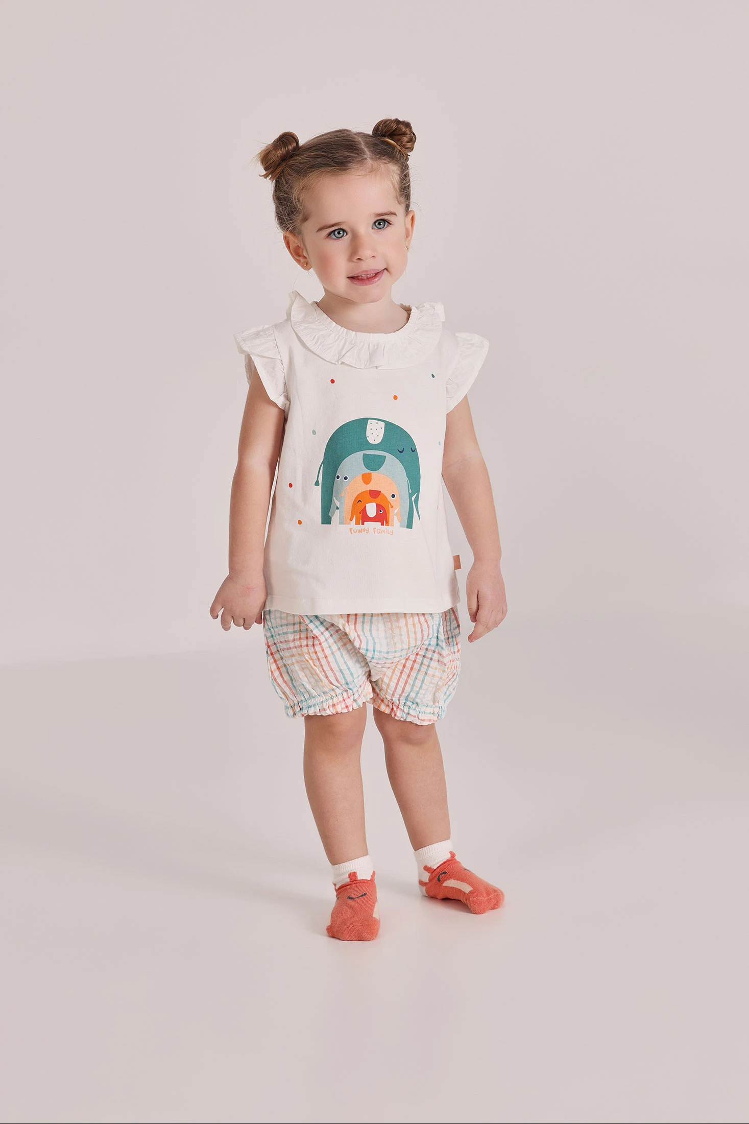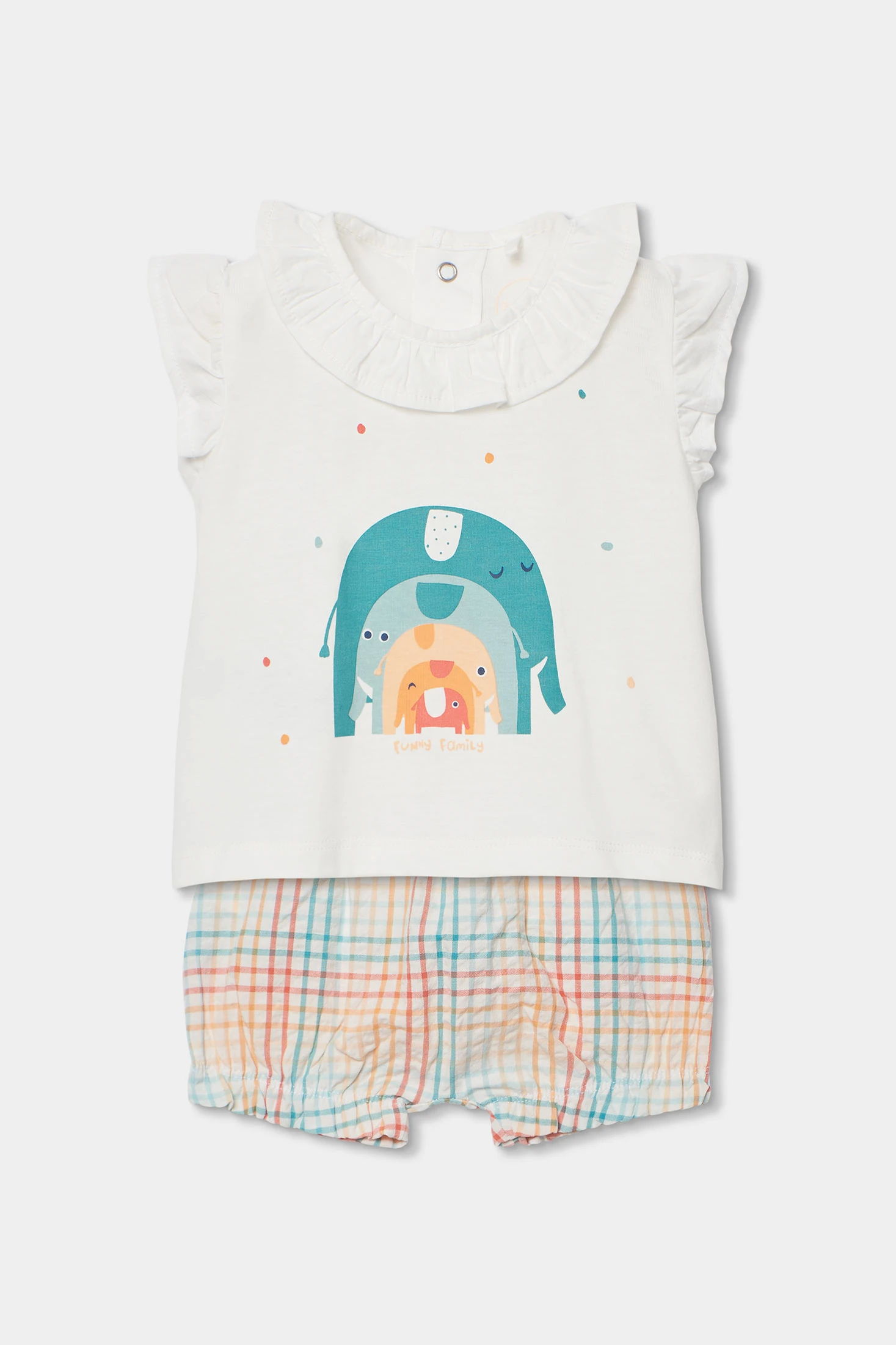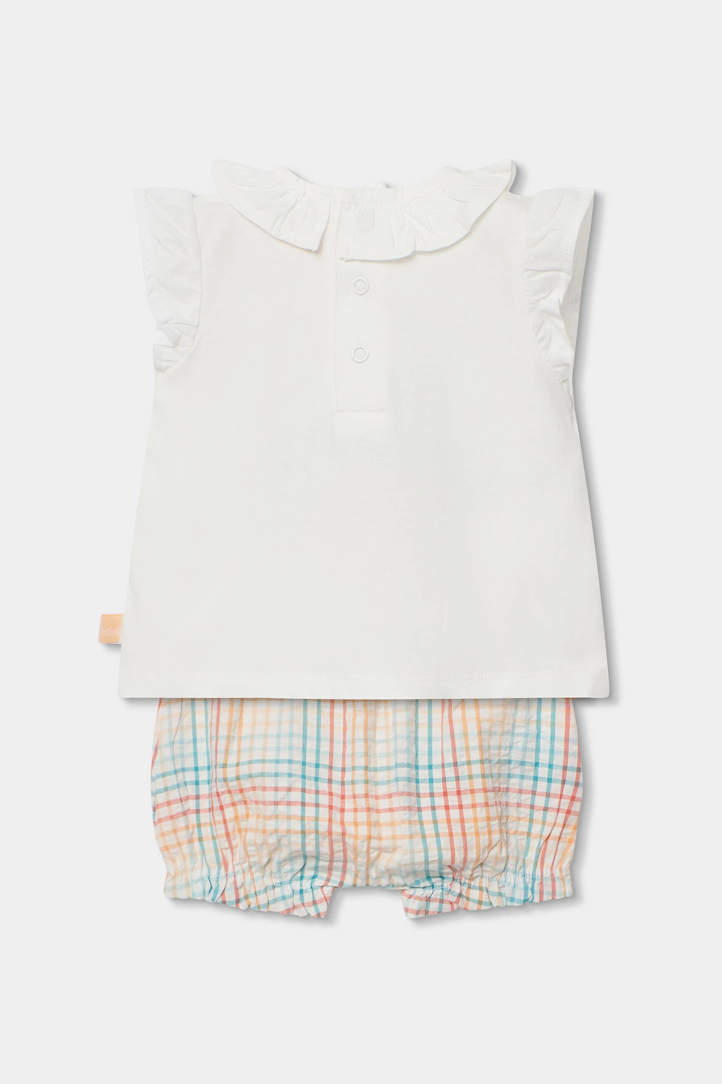 Ensemble pour bébé en tricot combiné avec du coton blanc, idéal pour les tout-petits. Son design présente un doux imprimé de charmants animaux sur la partie supérieure et un col volanté attrayant, ajoutant une touche charmante. Les shorts à carreaux dans des tons doux complètent parfaitement l'ensemble. Disponible en tailles allant de 1 mois à 24 mois, il garantit confort et style pendant la croissance du bébé. Parfait pour garder votre petit au frais et à la mode en toute occasion décontractée.