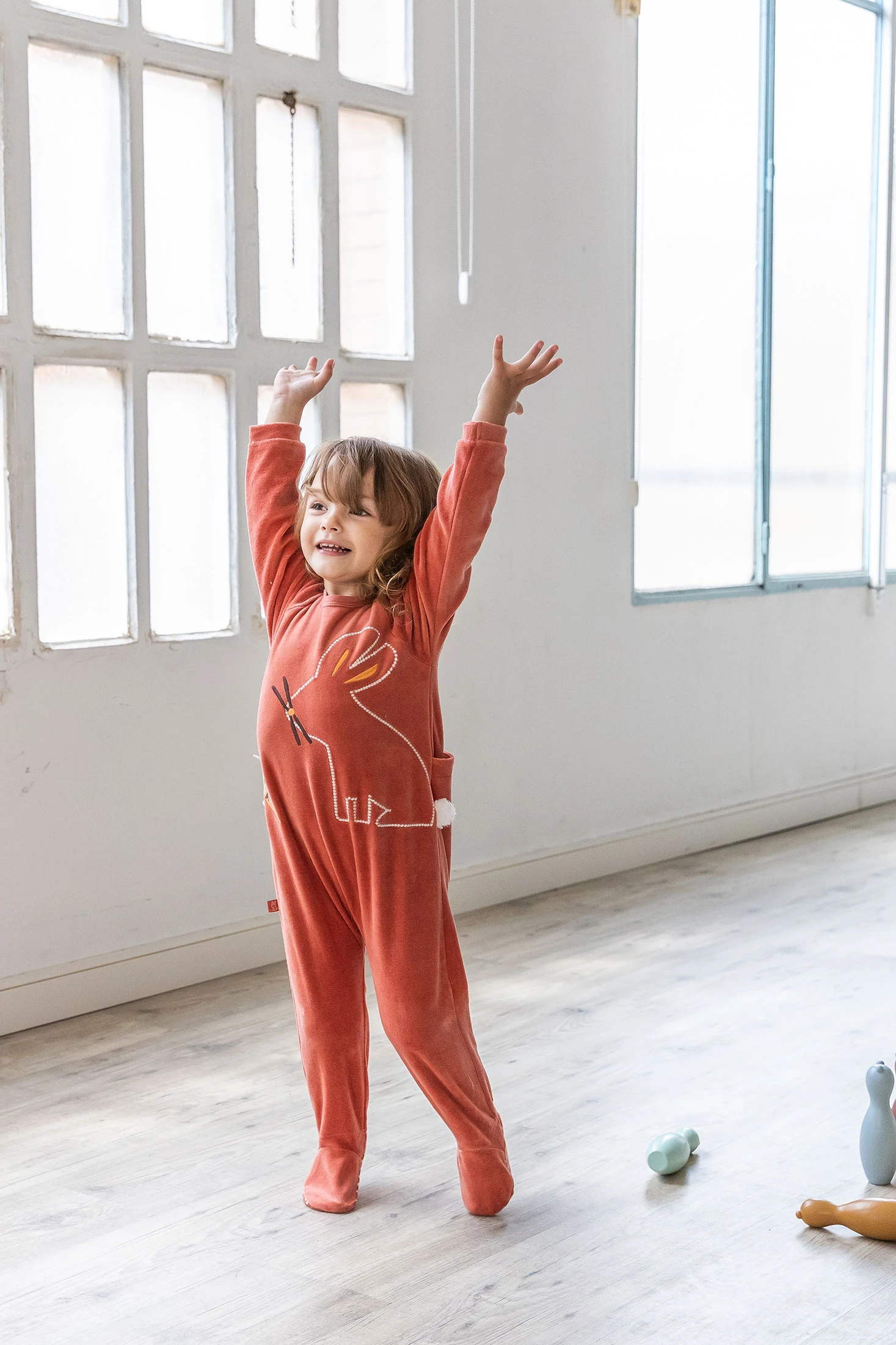 Grenouillère en velours pour bébé, idéale pour la saison automne-hiver, offrant chaleur et confort grâce à son tissu doux et accueillant. Elle se distingue par son design attrayant de couleur terracotta avec un charmant motif animal, ajoutant une touche ludique. Les manches longues et les pieds fermés garantissent que le bébé reste bien au chaud à tout moment. Disponible en tailles allant de 0 mois à 2 ans, cette grenouillère est une option pratique et stylée pour le quotidien ou les activités informelles. Se combine facilement avec des accessoires dans des tons terre ou neutres pour compléter le look du petit.