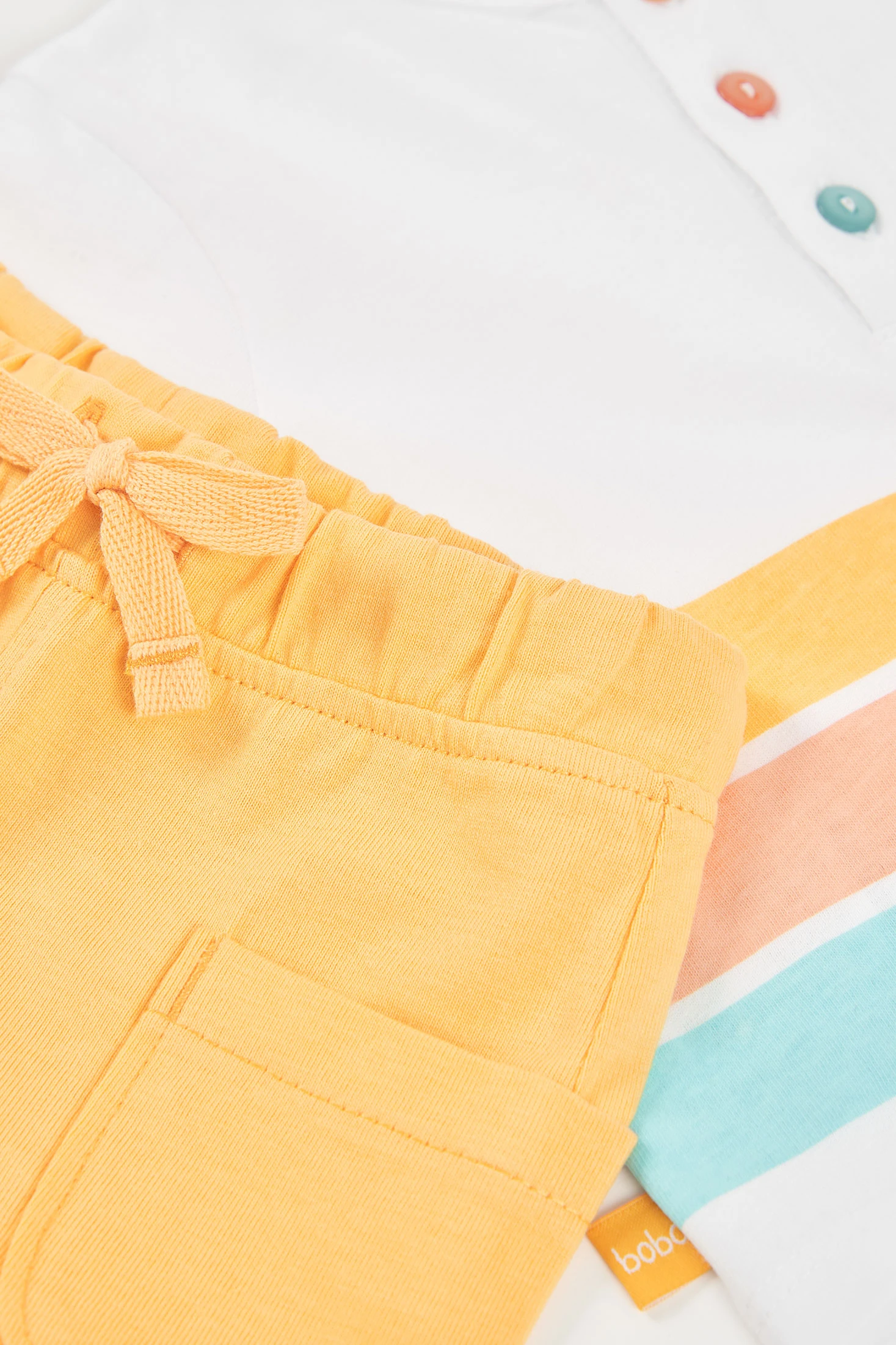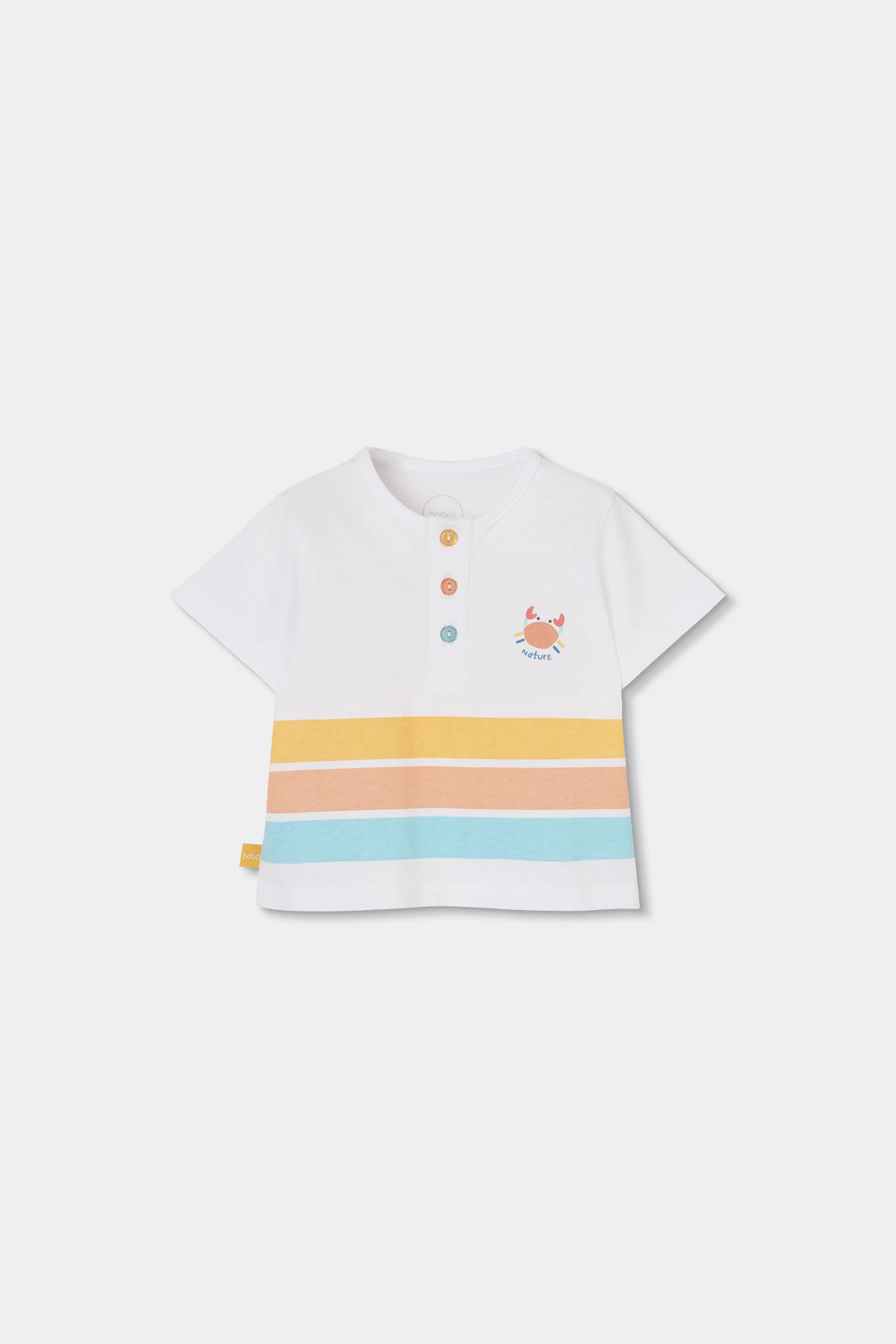 Ensemble en coton blanc pour bébé garçon, idéal pour les premiers mois de vie. Disponible en tailles de 1 mois à 24 mois, il offre confort et style. Le t-shirt blanc présente un imprimé de lignes colorées et un dessin de crabe avec des boutons décoratifs sur la poitrine. Les manches courtes et le col rond assurent une facilité de mouvement. Le short jaune complète le design, apportant fraîcheur. Parfait pour les climats chauds, cet ensemble est pratique et joyeux pour toute occasion décontractée.