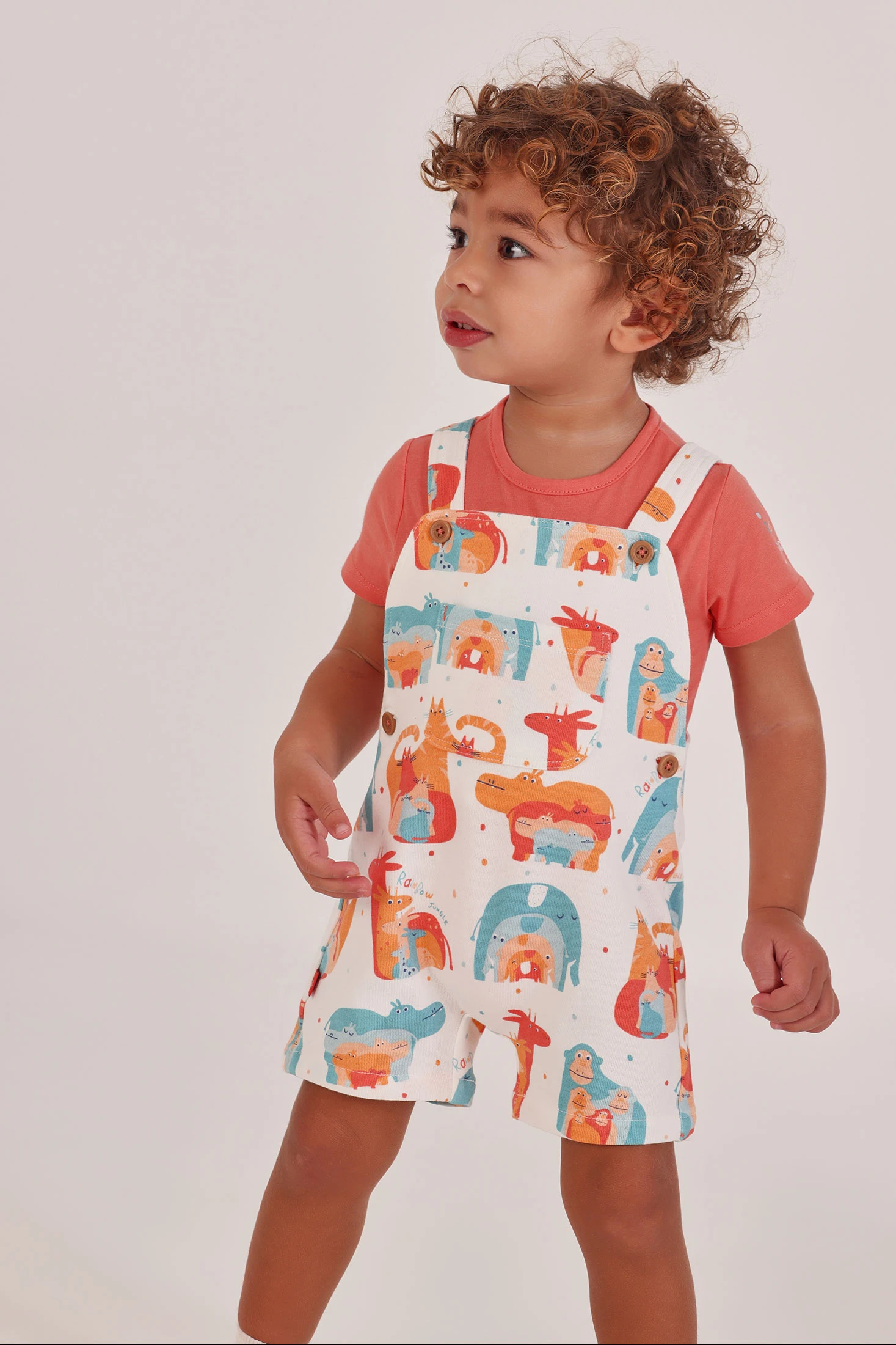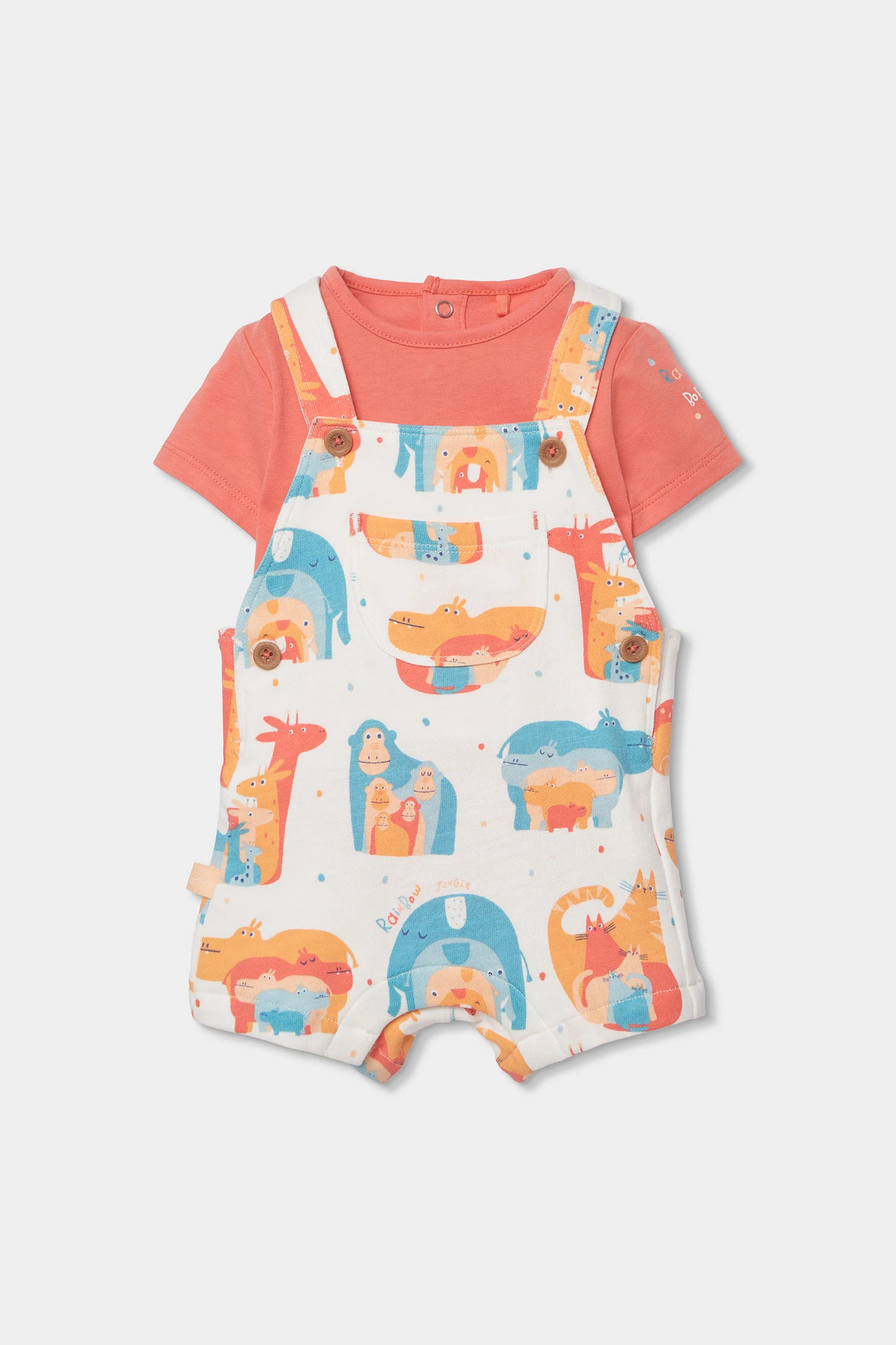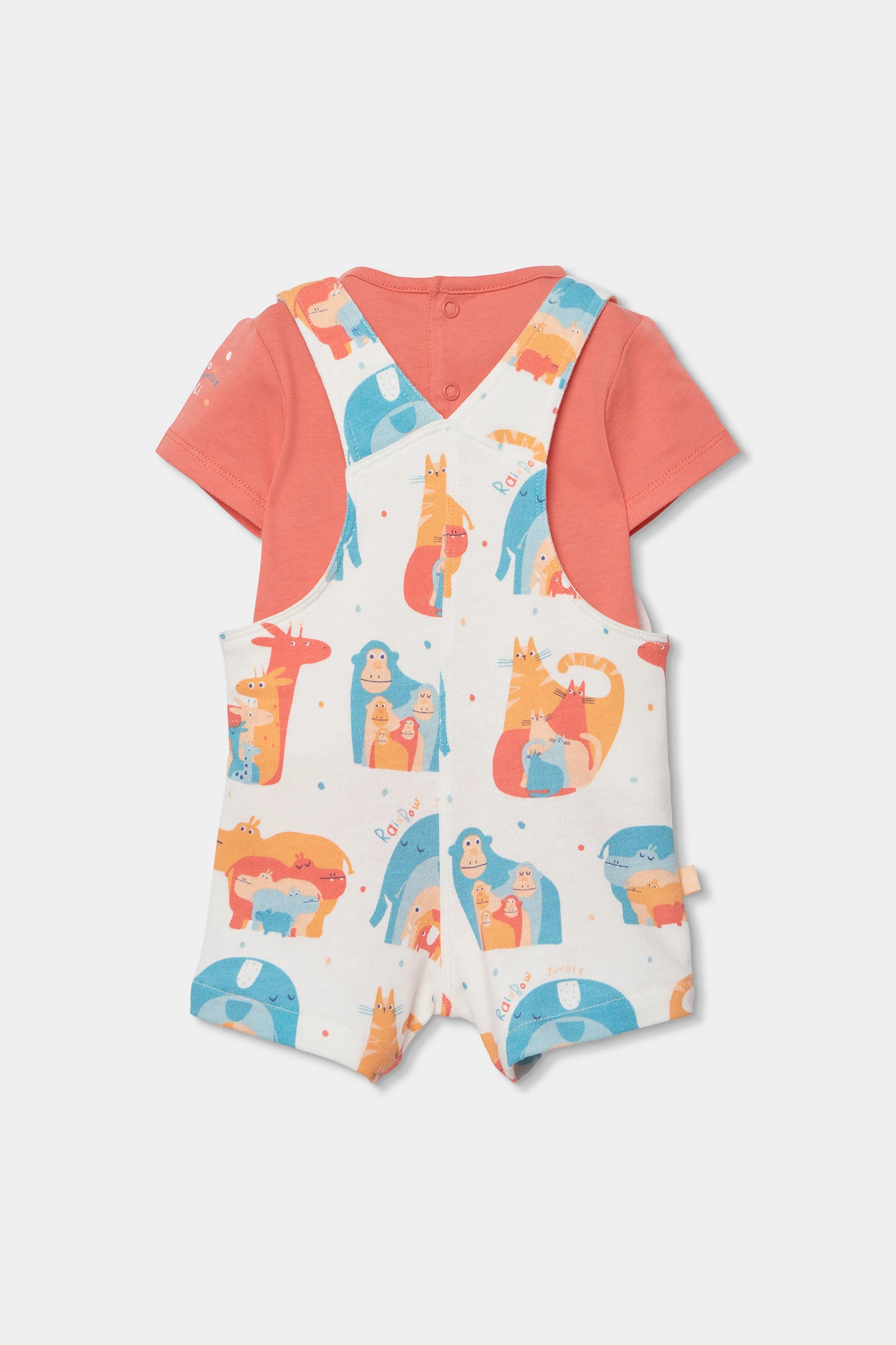 Ensemble pour garçon en tricot de coton, idéal pour maintenir le confort et la douceur. Présente un imprimé coloré avec des animaux qui ajoute une touche amusante. Le design inclut un t-shirt de couleur corail sous une salopette à boutons, pratique et facile à utiliser. Disponible en tailles de 1 mois à 24 mois, il est parfait pour s'adapter à la croissance du bébé. Les tons vifs et le motif joyeux font de cet ensemble un choix idéal pour le quotidien, offrant style et confort à la fois.