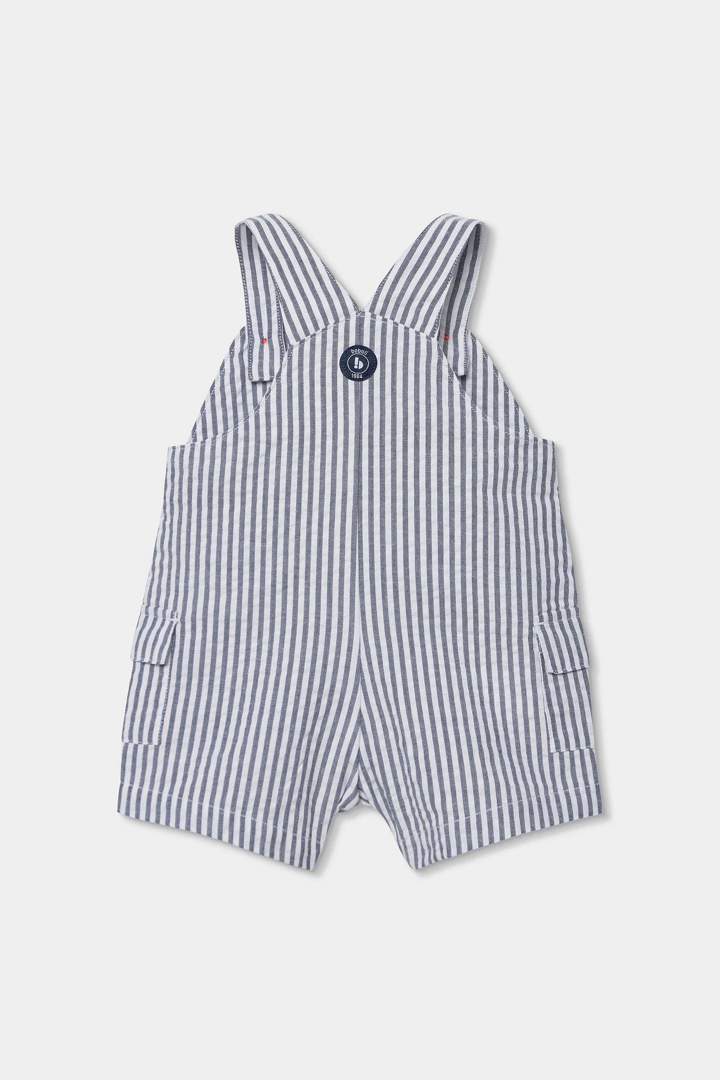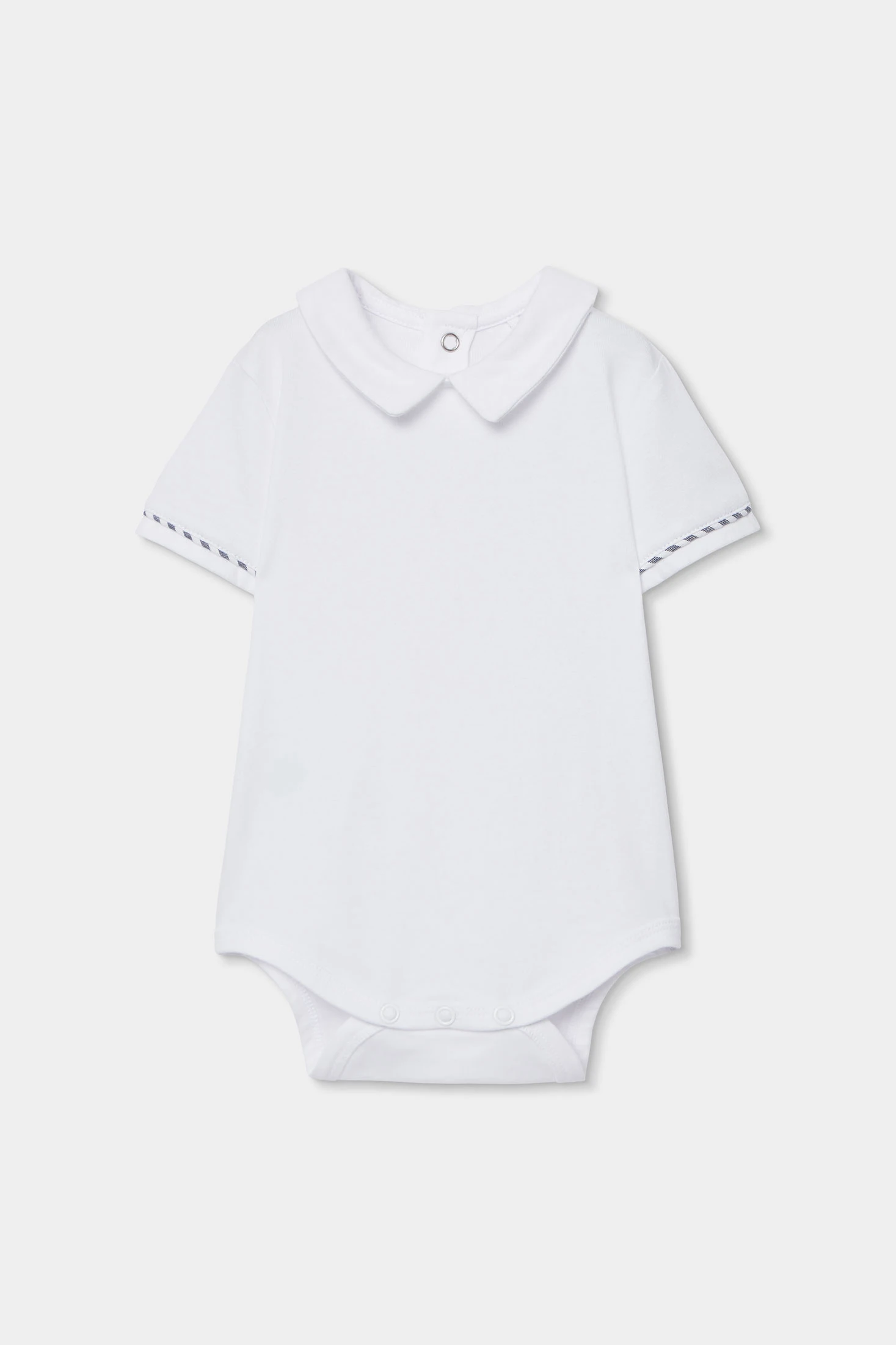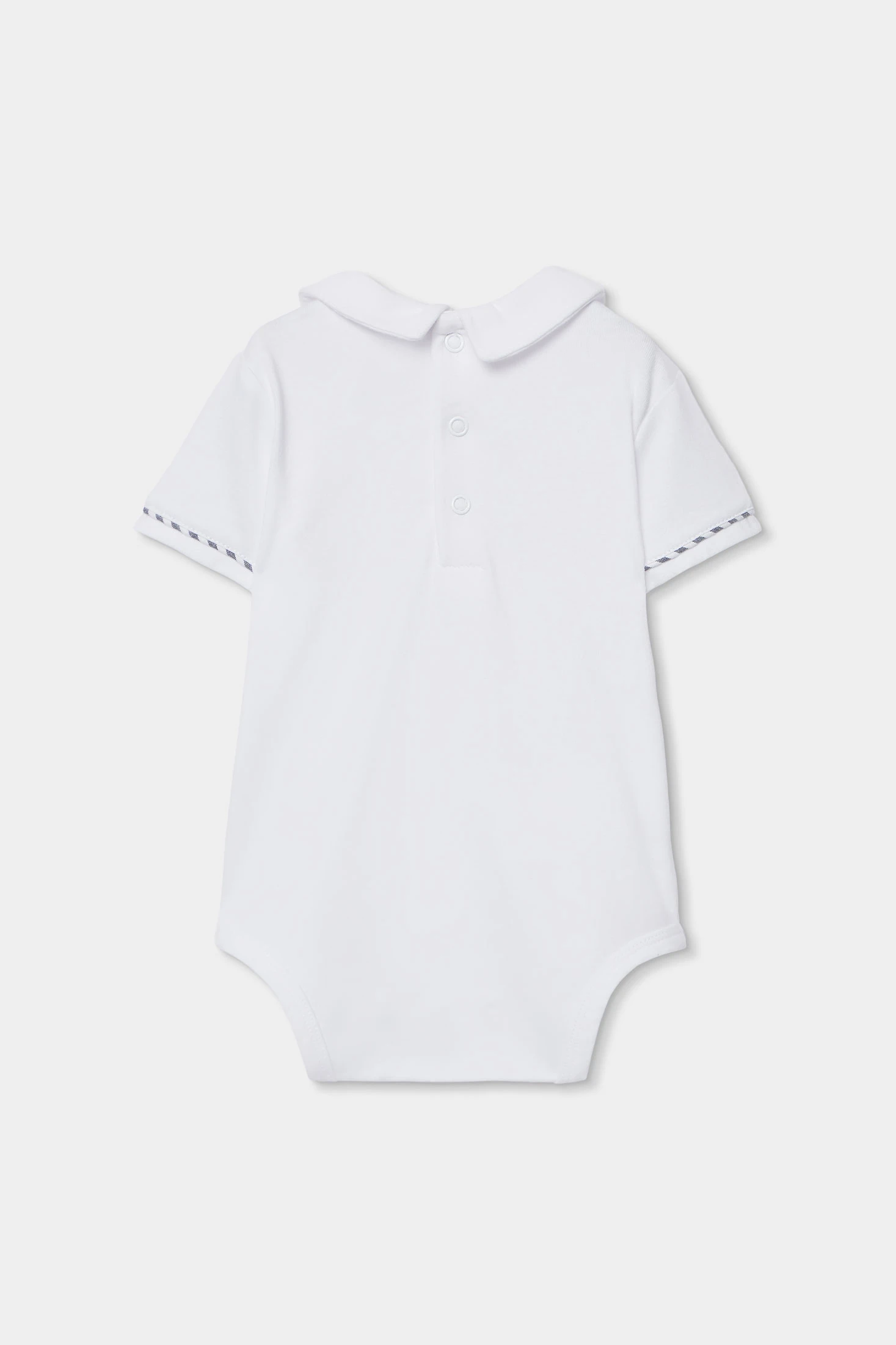 Ensemble en maille pour bébé, idéal pour toute occasion, confectionné en coton blanc et bleu. Le design inclut un motif de rayures avec un détail de phare brodé sur la poitrine, ajoutant une touche marine et charmante. Disponible en tailles de 1 mois à 2 ans, s'adaptant parfaitement à la croissance du bébé. Le matériau est doux et confortable, parfait pour la peau sensible des tout-petits. Les manches courtes et le col classique ajoutent du style, constituant un choix adéquat pour s'associer à différents accessoires.