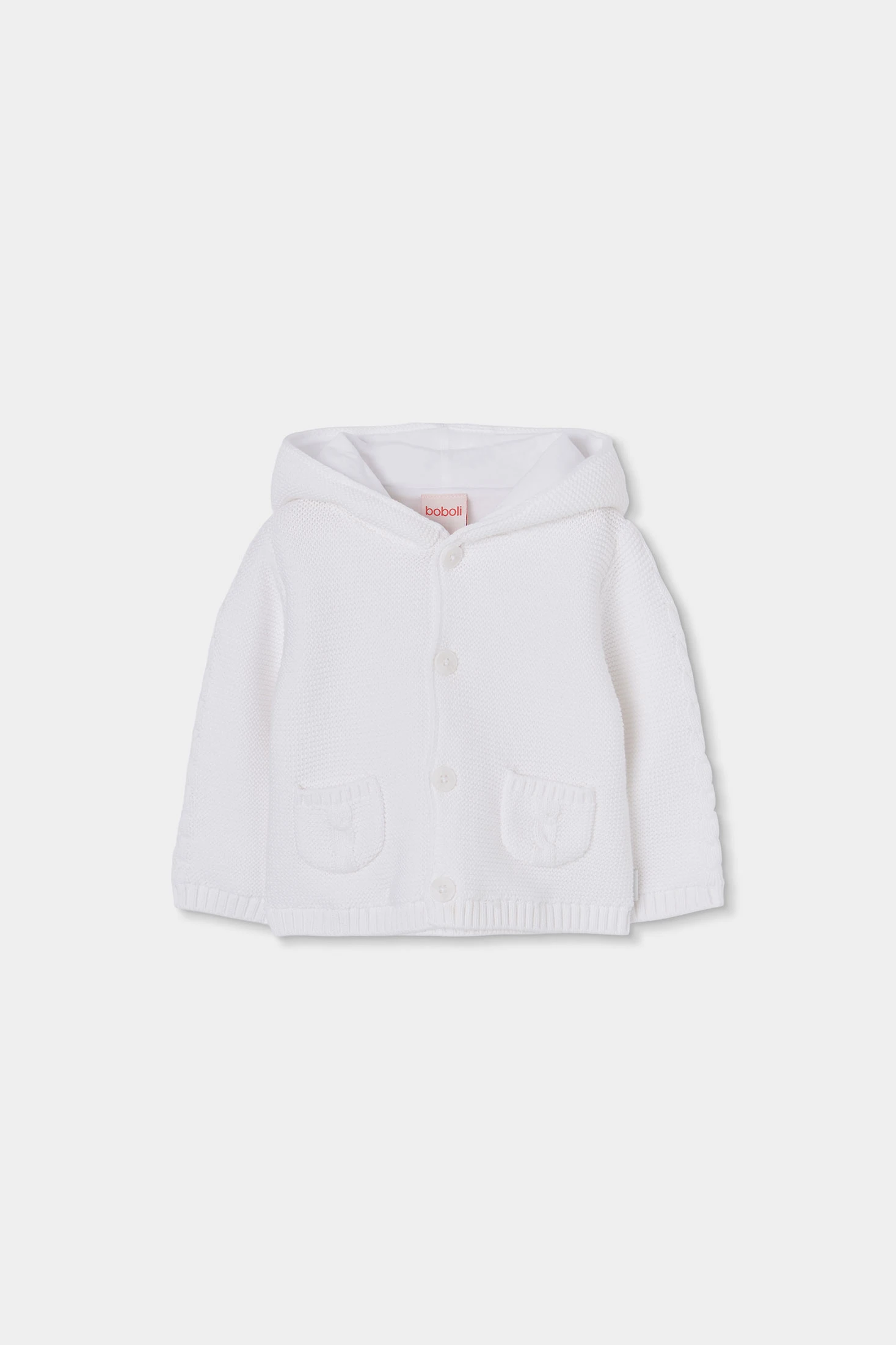 Veste en tricot blanche pour bébé, idéale pour garder votre petit au chaud pendant le printemps. Son design classique inclut une capuche pour une protection supplémentaire. Le tissu en tricot est doux et confortable, parfait pour un usage quotidien. Disponible en tailles de 1 mois à 2 ans, elle s'adapte à la croissance de votre bébé. Avec une fermeture à boutons et deux poches avant, ce vêtement est pratique et élégant. La couleur blanche la rend facilement associable avec d'autres vêtements de la garde-robe enfantine.