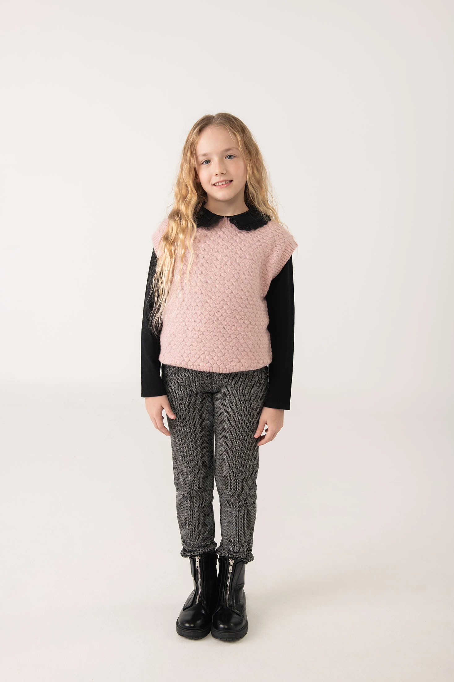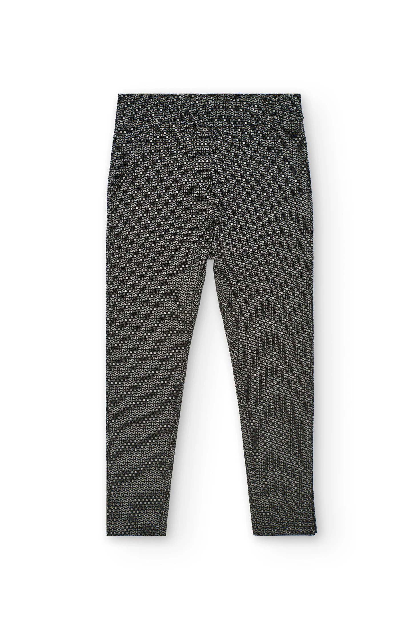 Pantalon pour fille en couleur noire avec un motif géométrique subtil, conçu pour offrir style et confort. Confectionné en tissu maille élastique, il facilite le mouvement et est idéal pour la saison automne-hiver. Sa coupe ajustée et sa taille élastique assurent un ajustement parfait et confortable. Disponible en tailles de 2 à 14 ans, il constitue un choix polyvalent, facilement combinable avec des pulls, manteaux ou t-shirts pour créer un look moderne et élégant.