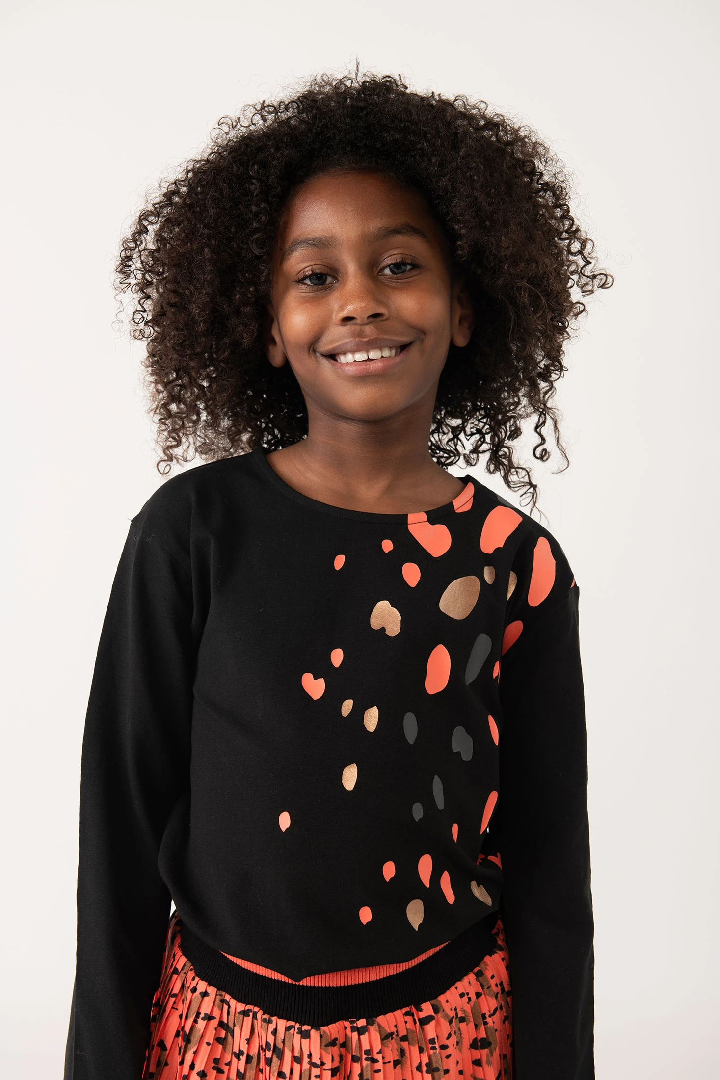 T-shirt en maille pour fille de couleur noire avec un élégant motif abstrait en plusieurs couleurs, conçue pour apporter une touche moderne et sophistiquée à la garde-robe de toute fille. Confectionnée en maille de haute qualité, cette T-shirt assure confort et fraîcheur, étant parfaite pour la saison automne-hiver. Disponible en tailles pour filles de 2 à 14 ans, elle garantit un ajustement confortable pour un usage quotidien. Associez-la avec des pantalons ou des jupes pour créer des looks décontractés ou plus formels, s'adaptant à toute occasion.
