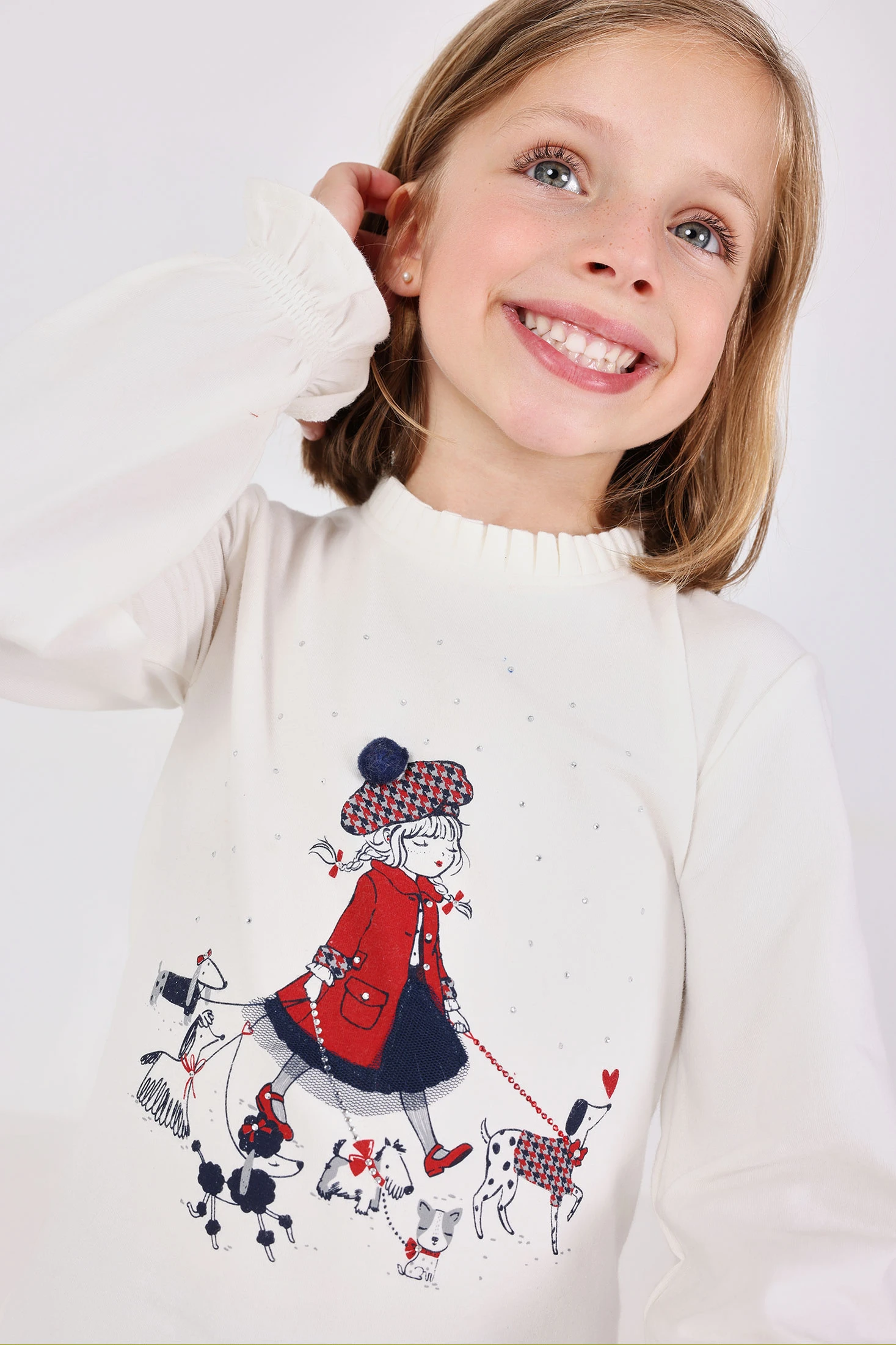 T-shirt en maille pour fille en couleur blanche avec un imprimé d'animaux, ajoutant une touche de gaieté à n'importe quelle tenue enfantine. Confectionnée dans un tissu doux et confortable, elle est parfaite pour garder les plus petits au chaud pendant l'automne et l'hiver. Son design à col rond offre un ajustement confortable et est facile à enfiler, tandis que sa polyvalence permet de l'associer à des pantalons, jupes ou leggings. Disponible en tailles allant de 12 mois à 10 ans, ce vêtement est un choix pratique et élégant pour n'importe quelle garde-robe enfantine.