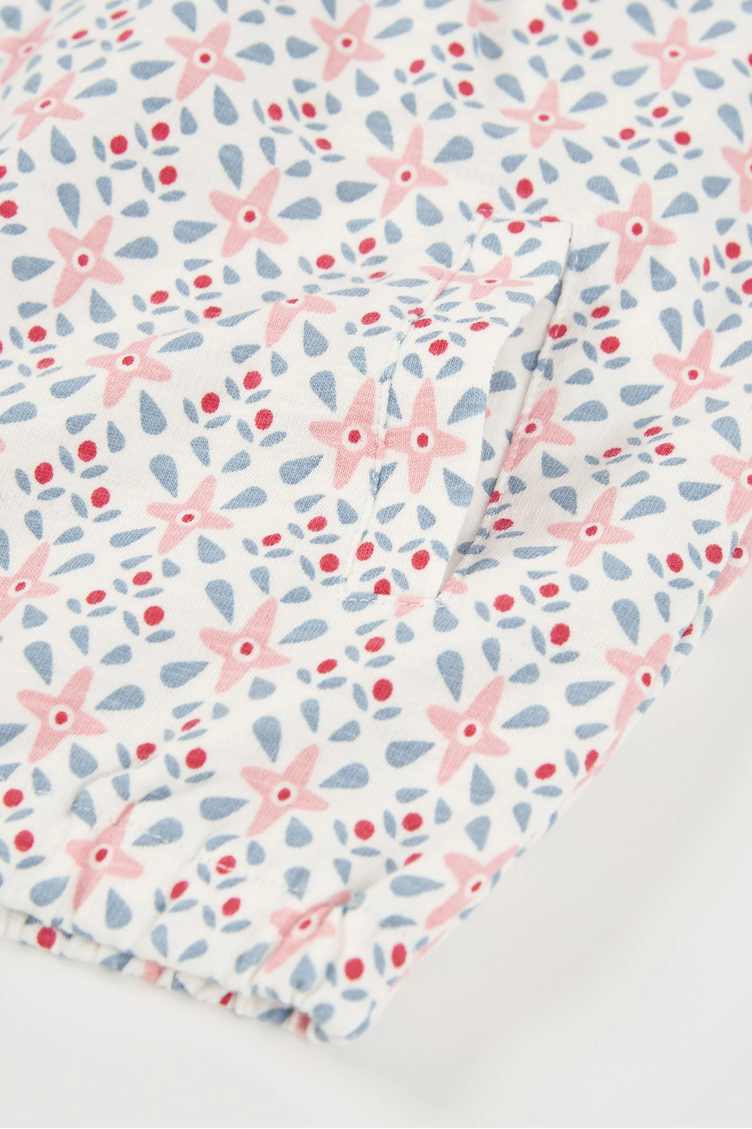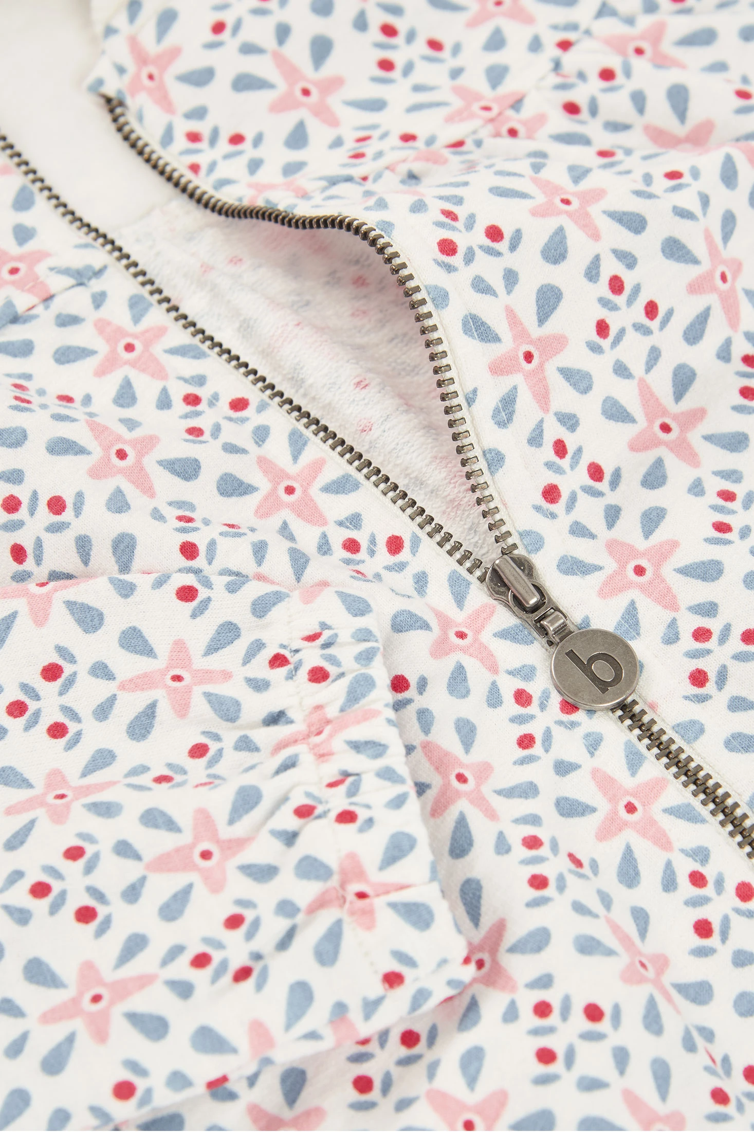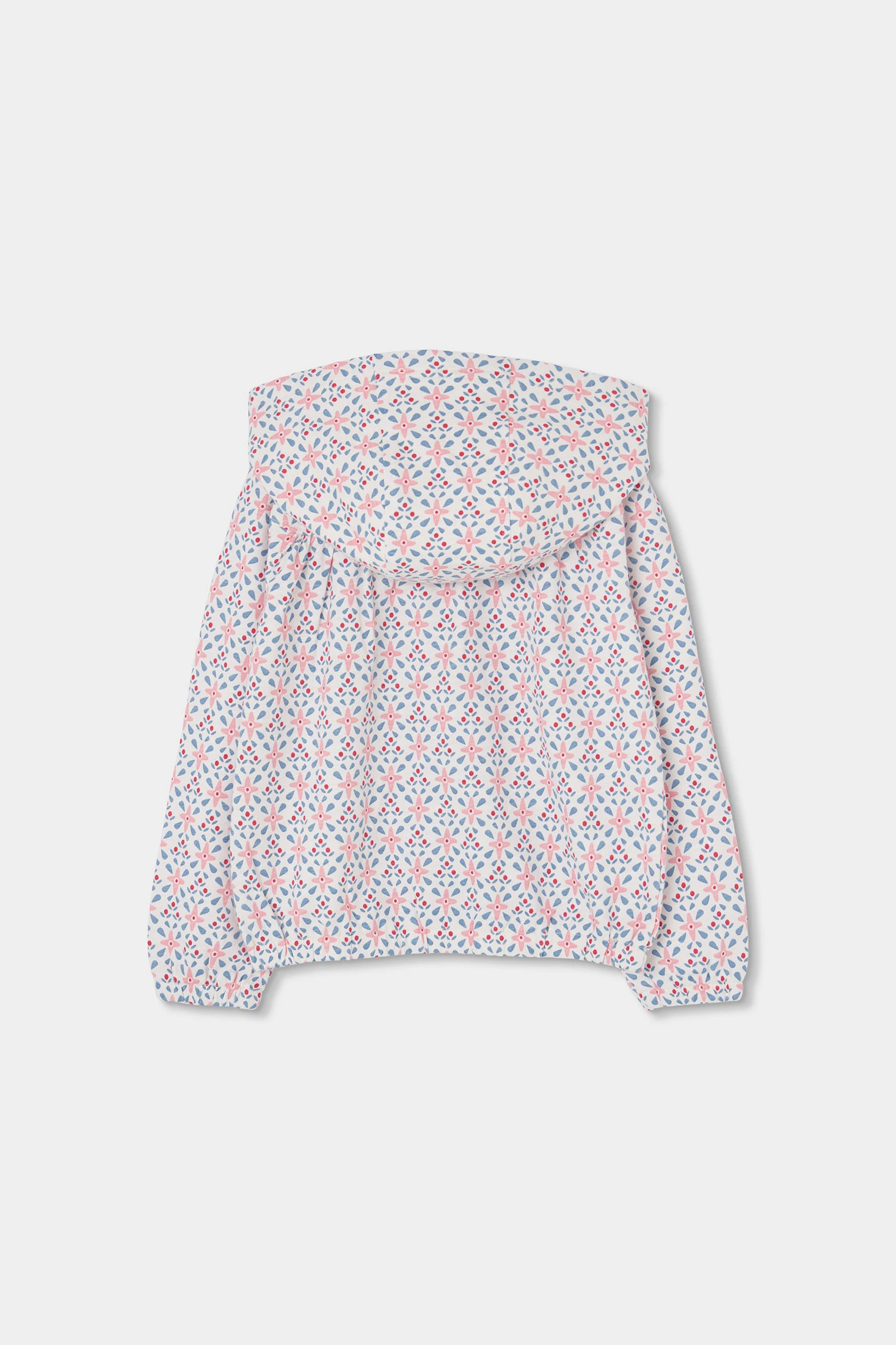 Veste en peluche pour fille. Elle présente un imprimé coloré dans les tons bleu et rose sur fond blanc. Sa fermeture est à glissière et le design inclut une capuche amovible. Disponible en tailles allant de 12 mois à 10 ans. Avec ses manches longues, elle est idéale à assortir avec des pantalons et des jupes, ajoutant une touche gaie à la garde-robe de n'importe quelle fille.