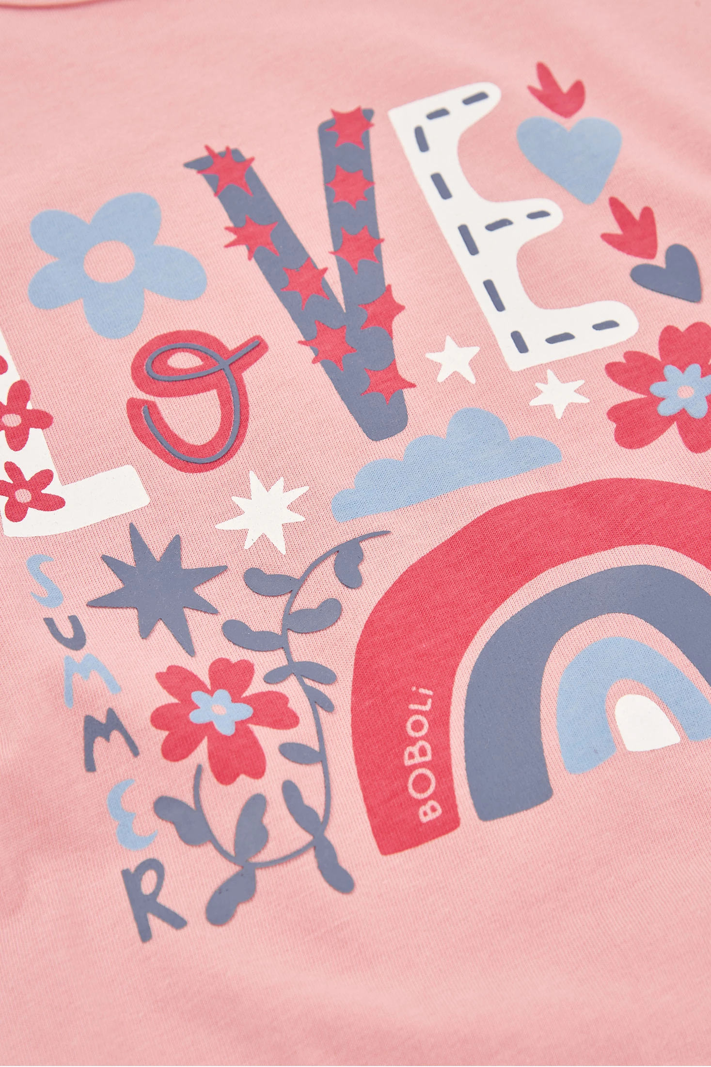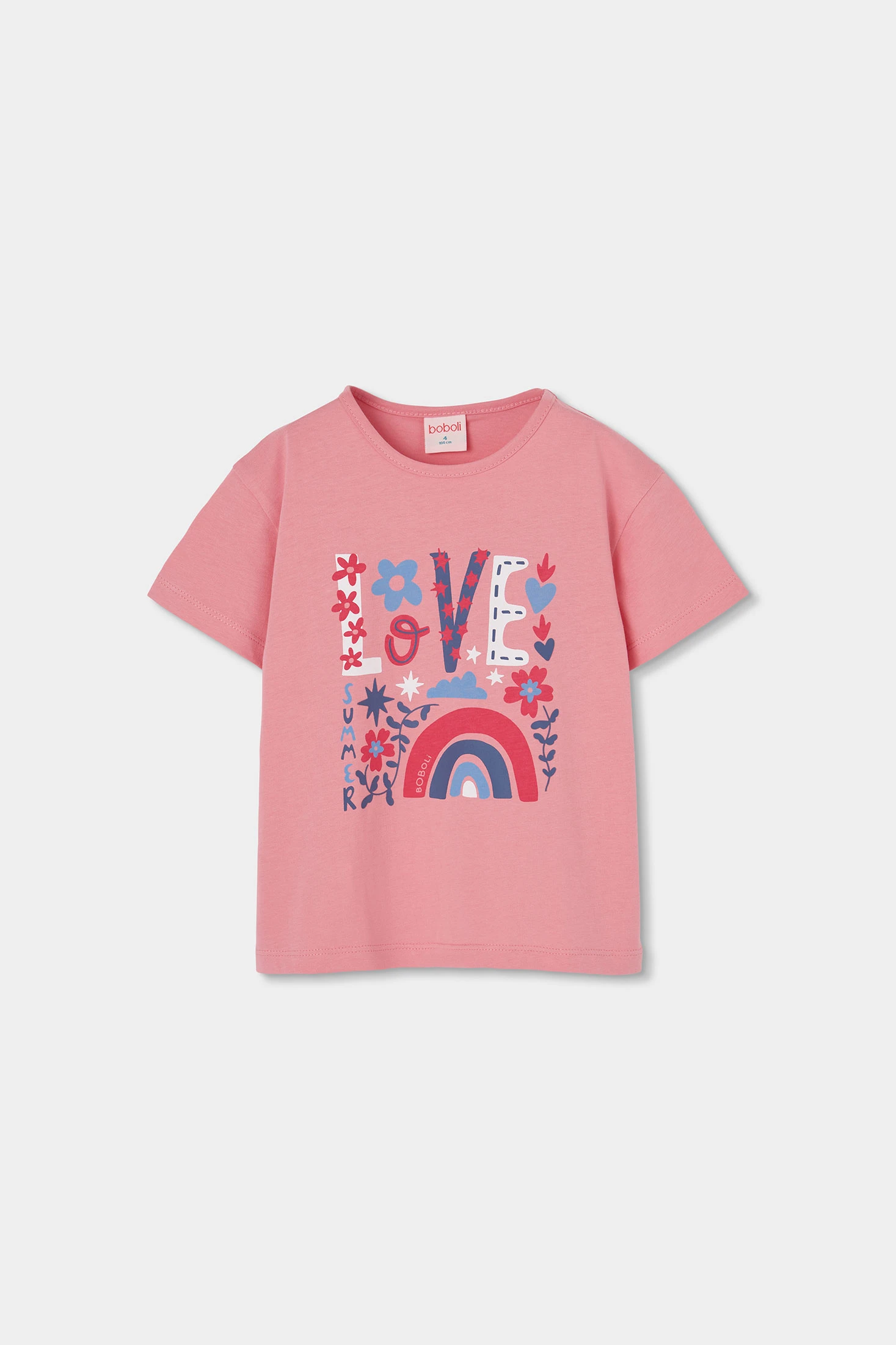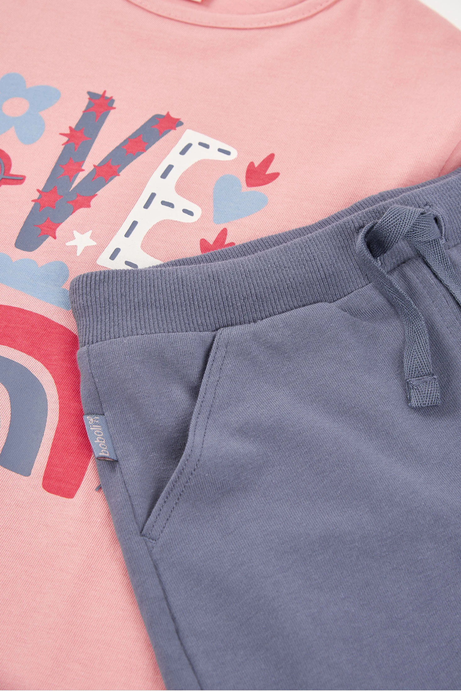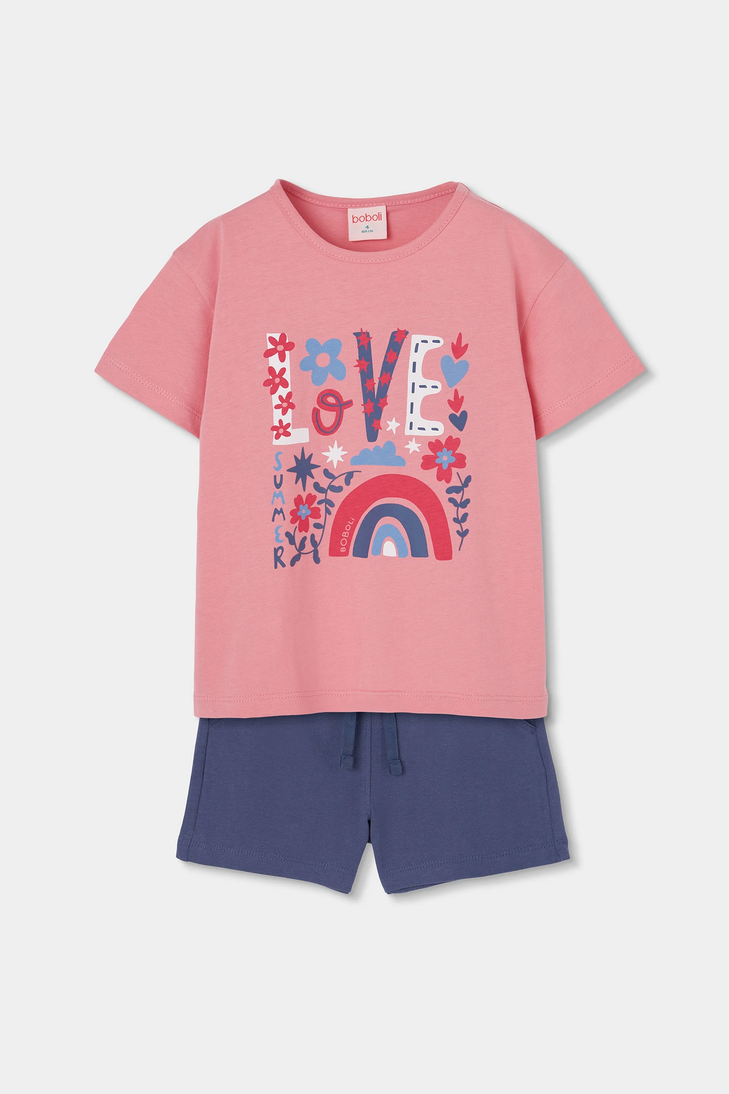 Ensemble de t-shirt et short en maille. T-shirt en coton de couleur rose, parfait pour le quotidien. Le t-shirt arbore un motif multicolore, ce qui lui confère une touche joyeuse et amusante. Avec son col rond et ses manches courtes, il est idéal pour rester au frais pendant les saisons les plus chaudes. Disponible en tailles de 12 mois à 10 ans, il s'adapte à la croissance des filles.