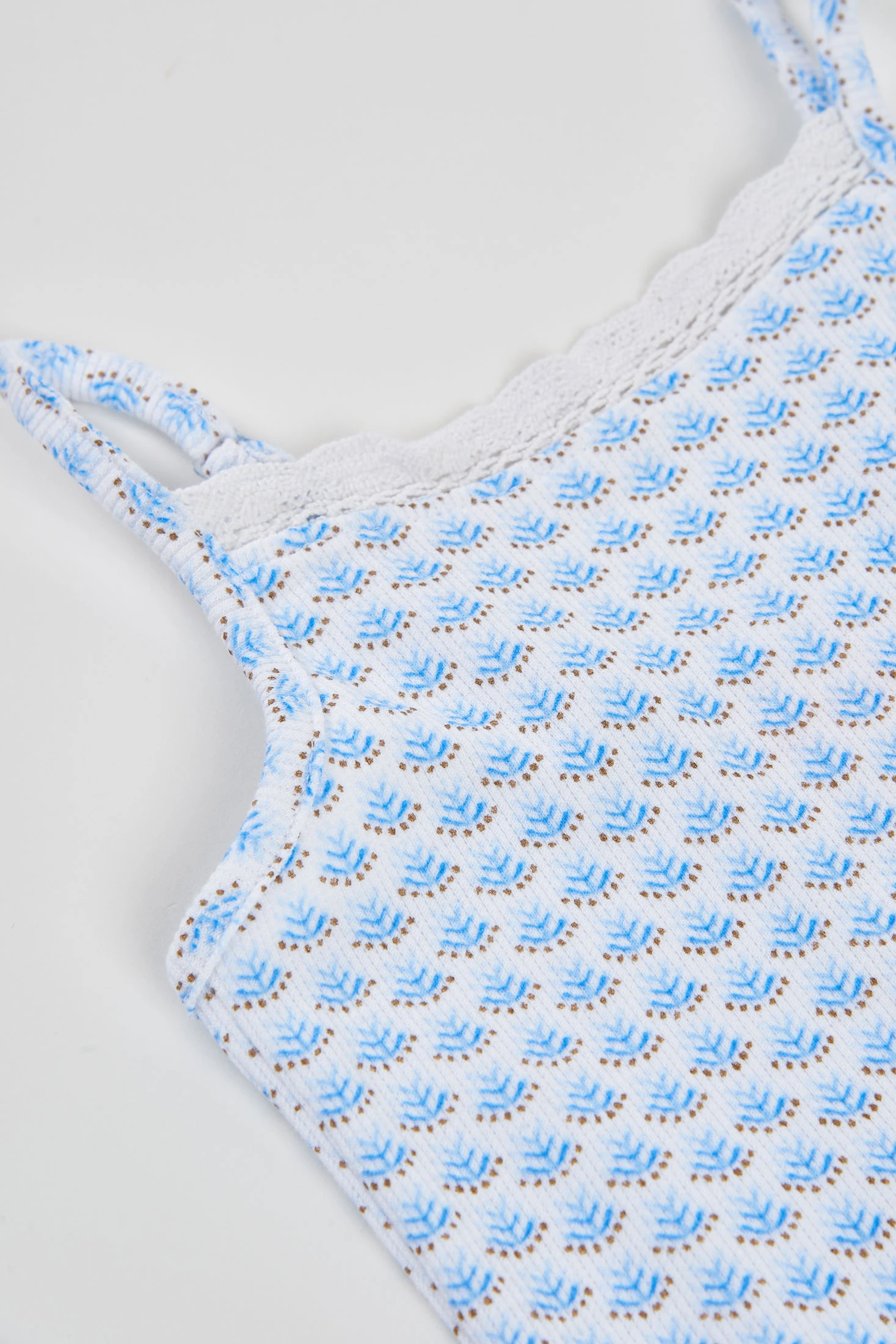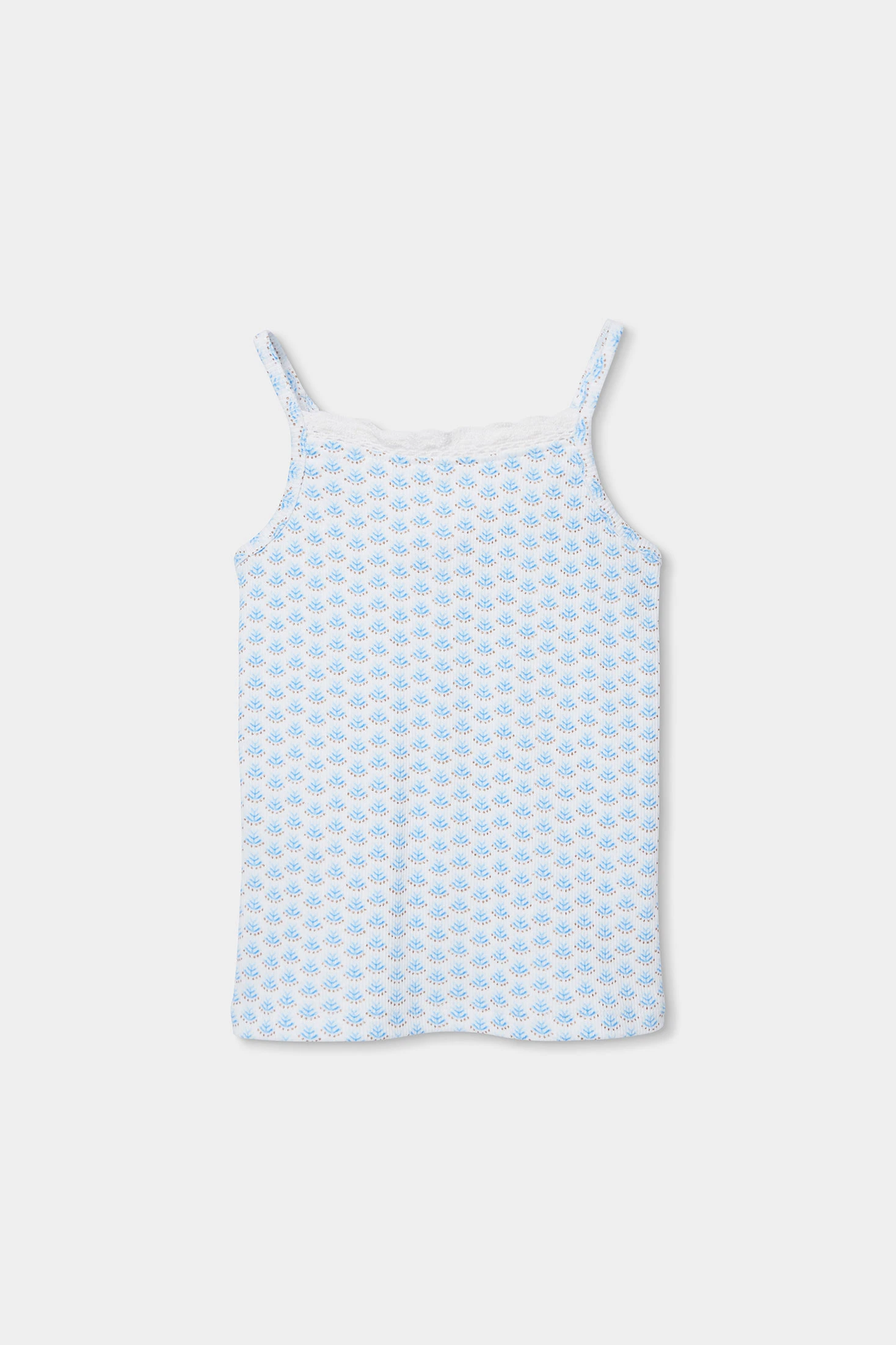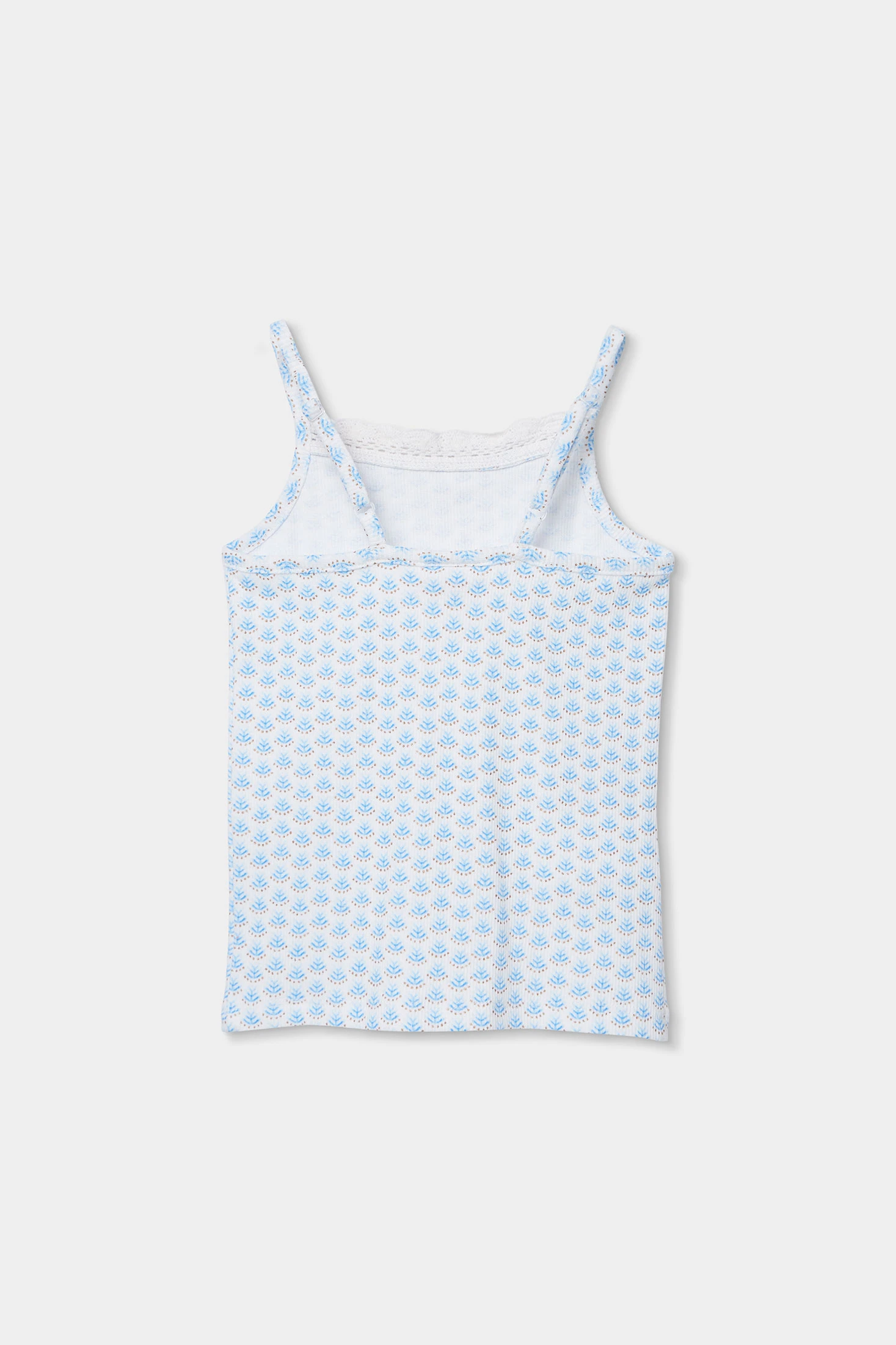 Débardeur pour fille idéal pour les saisons les plus chaudes. Son tissu en maille imprimée offre confort et fraîcheur. Il présente un design avec de petits motifs floraux bleus, apportant une touche douce et délicate. Le bord supérieur est orné de dentelle blanche, ajoutant un détail spécial. Disponible en tailles pour filles de 12 mois à 14 ans. La couleur blanche et bleue polyvalente permet de la combiner facilement avec des jupes ou des shorts, idéale pour un look décontracté et confortable.