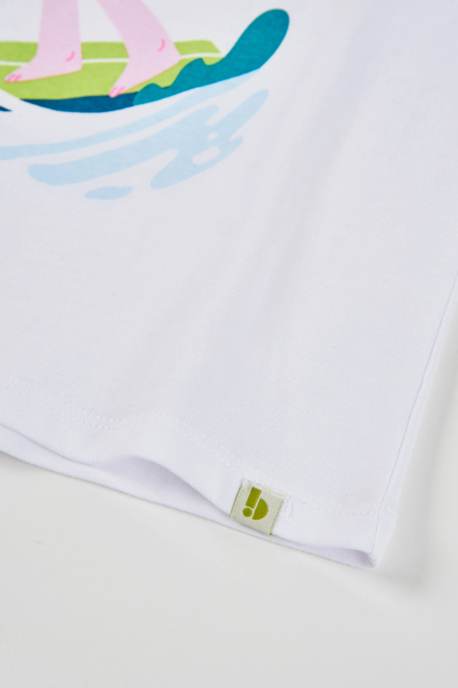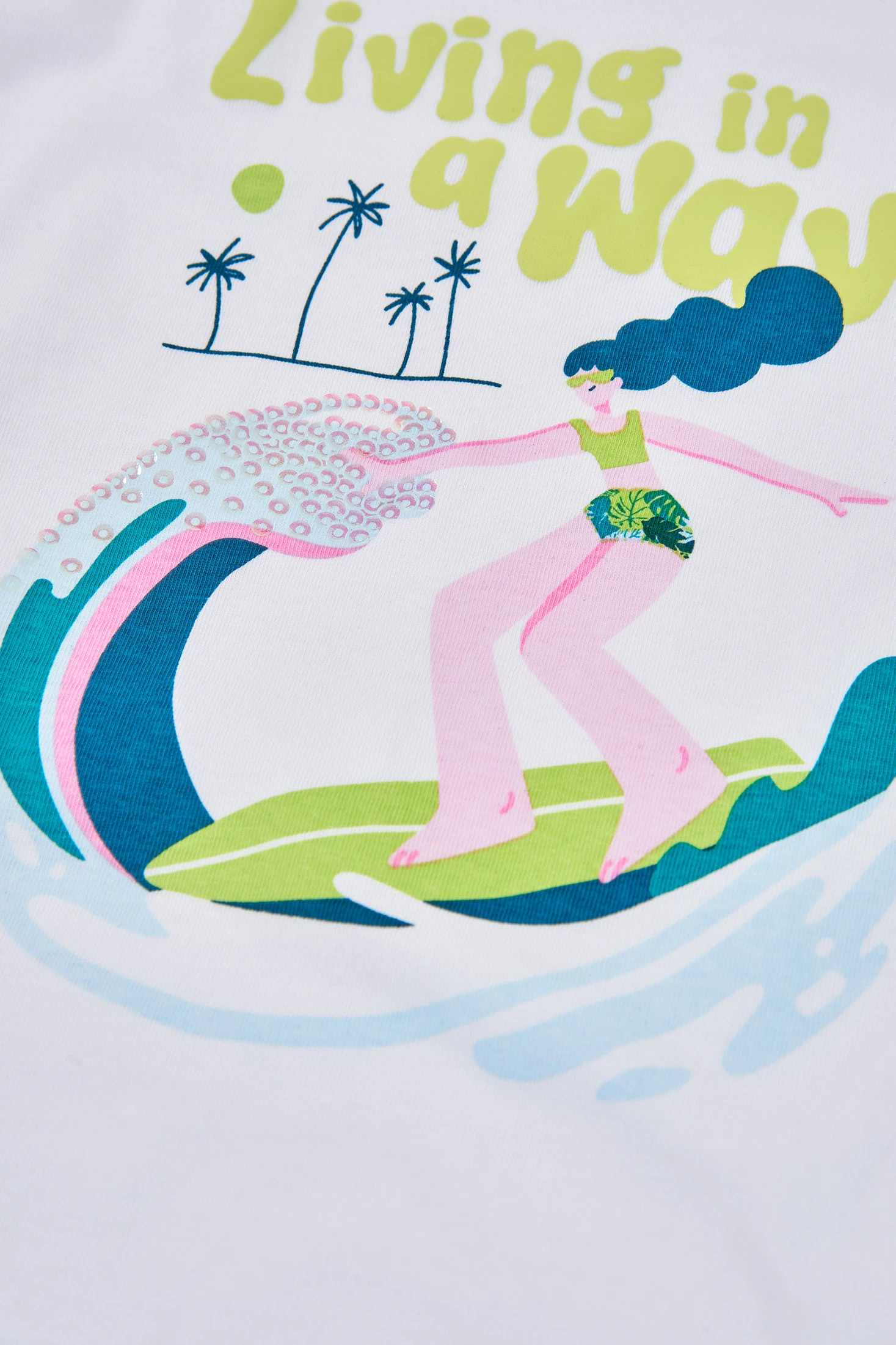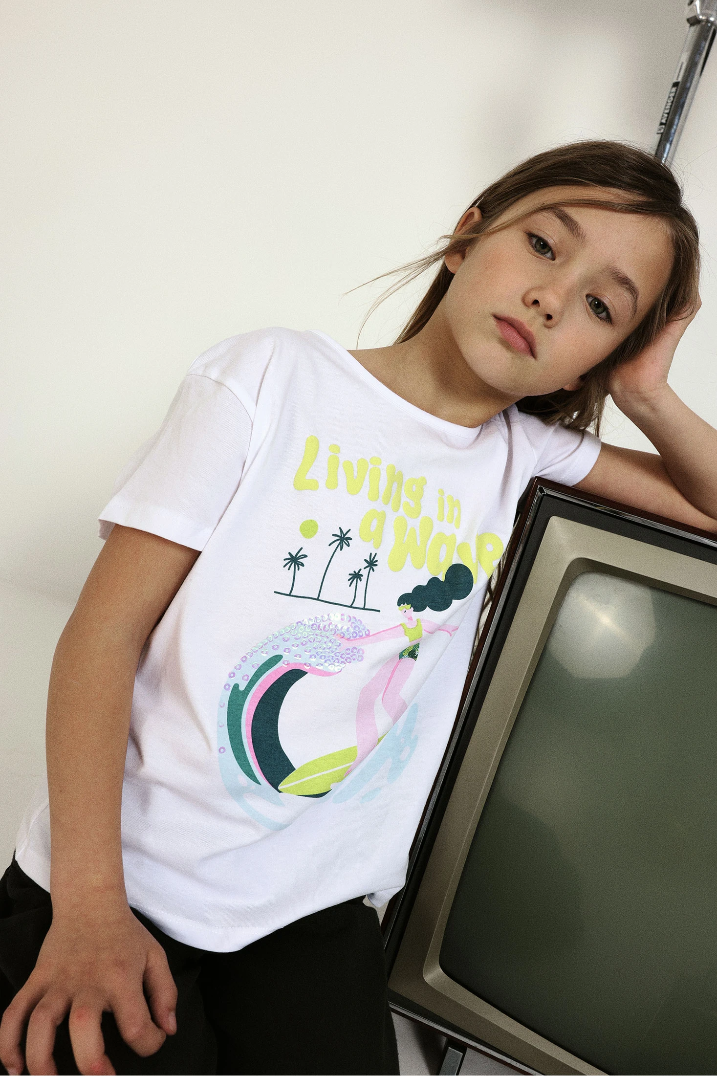 T-shirt en tricot de coton pour fille, idéale pour un style décontracté et confortable. De couleur blanche, elle présente un design coloré avec un imprimé estival qui inclut une surfeuse. Le matériau en tricot offre douceur et flexibilité, parfait pour un usage quotidien. Disponible en tailles de 2 ans à 14 ans, c'est un vêtement polyvalent qui peut se combiner facilement avec des jeans ou des shorts, ajoutant une touche amusante et fraîche à la garde-robe.