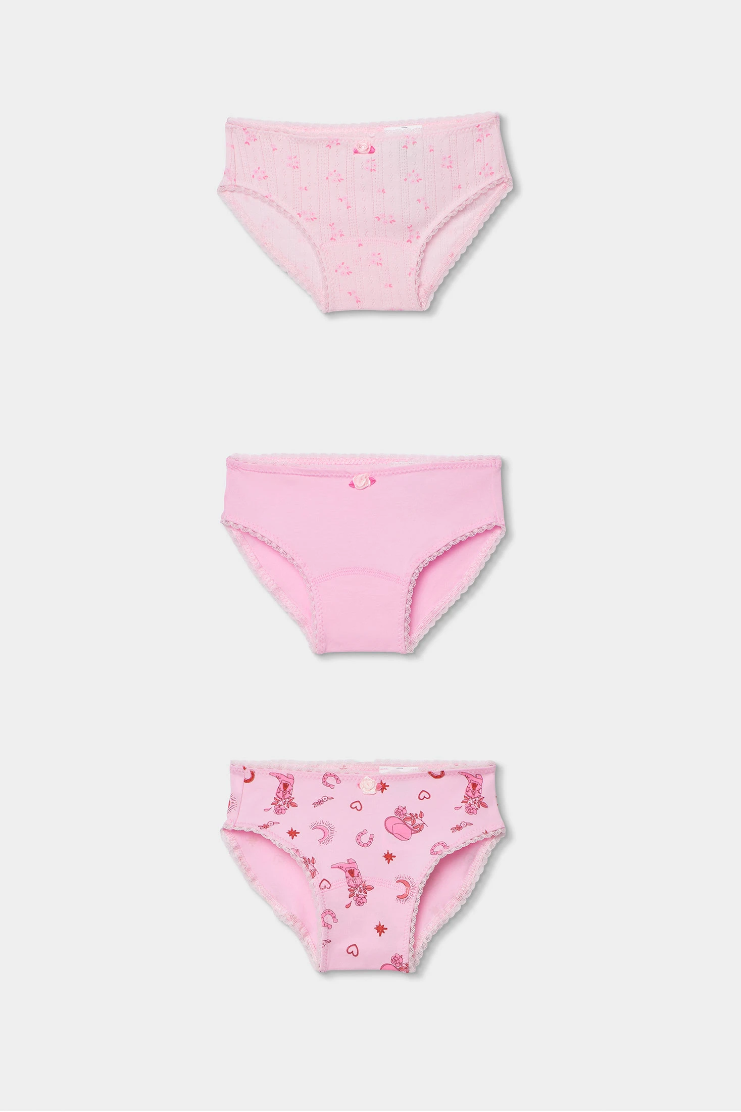 Pack de trois culottes en coton imprimé pour fille, idéales pour le confort quotidien. Chaque culotte présente un design unique en rose : une avec des petites fleurs, une unie et une avec des dessins amusants. Le matériau en coton assure douceur et fraîcheur, parfait pour un usage quotidien. Disponibles en tailles de 2 à 14 ans, elles s'adaptent à la croissance des petites. Elles sont parfaites pour accompagner n'importe quelle tenue décontractée. Leur design amusant et féminin est idéal pour les filles qui apprécient le confort et le style dans leur sous-vêtement.