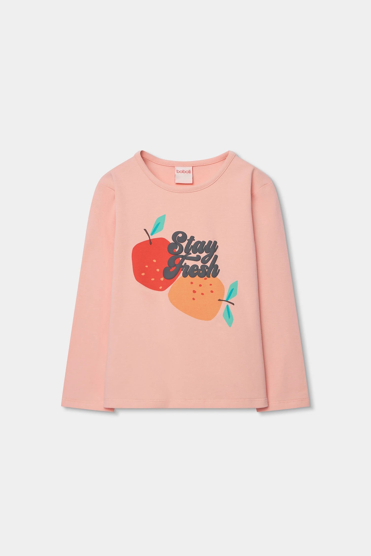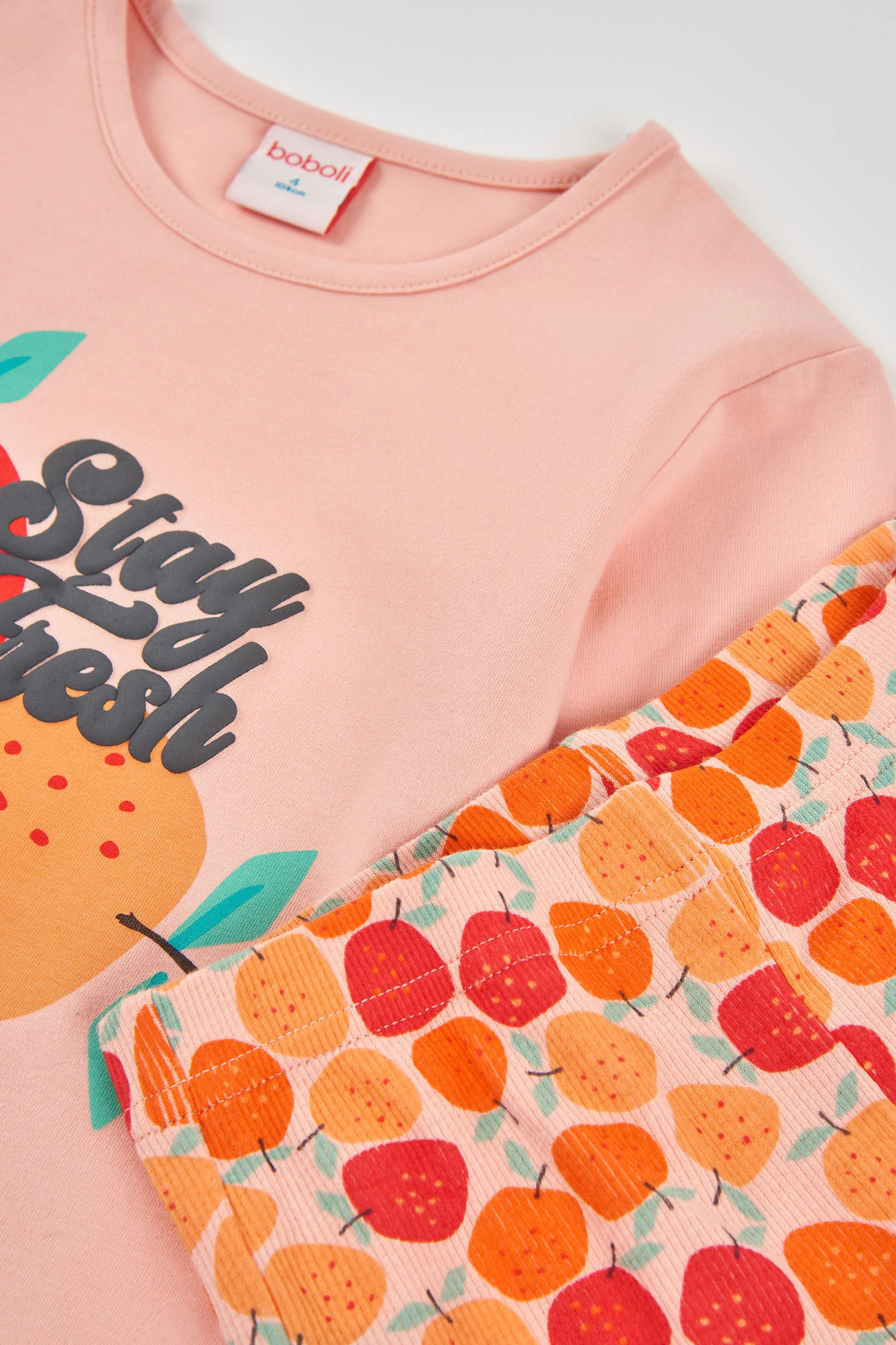 Pyjama en maille pour fille, dans une douce teinte saumon, parfait pour les mois les plus froids. Confectionné dans un matériau élastique et confortable, il présente un amusant imprimé frontal de fruits et un design de pantalon imprimé avec des fruits dans des tons orange et rouge. Les manches longues assurent chaleur pendant la nuit. Disponible en tailles de 2 à 12 ans. Idéal pour apporter chaleur et style à l'heure du coucher.