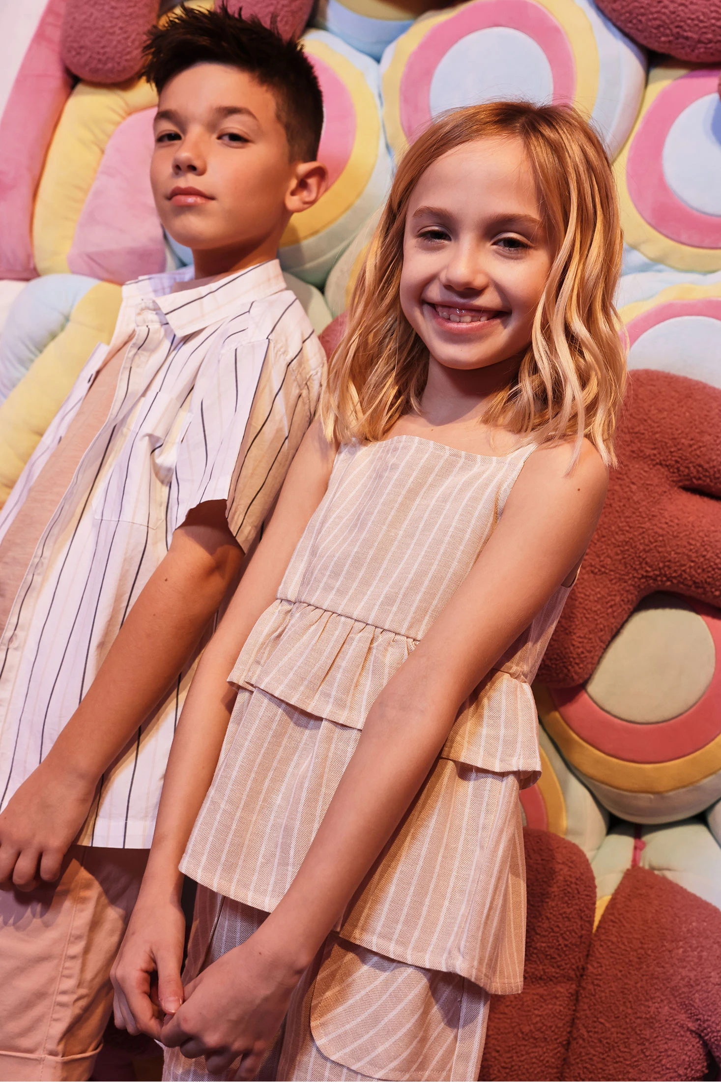 Haut en lin rayé pour fille, idéal pour les mois d'été, grâce à son tissu léger et respirant. Son design présente des bretelles larges et un volant à la base qui ajoute une touche charmante. La couleur beige avec des lignes verticales blanches en fait une pièce polyvalente et élégante. Disponible en tailles de 12 mois à 10 ans, il s'adapte à différents âges et étapes de croissance. Parfait pour assortir avec des jupes ou des pantalons légers, il offre un look frais et moderne pour toute occasion décontractée.