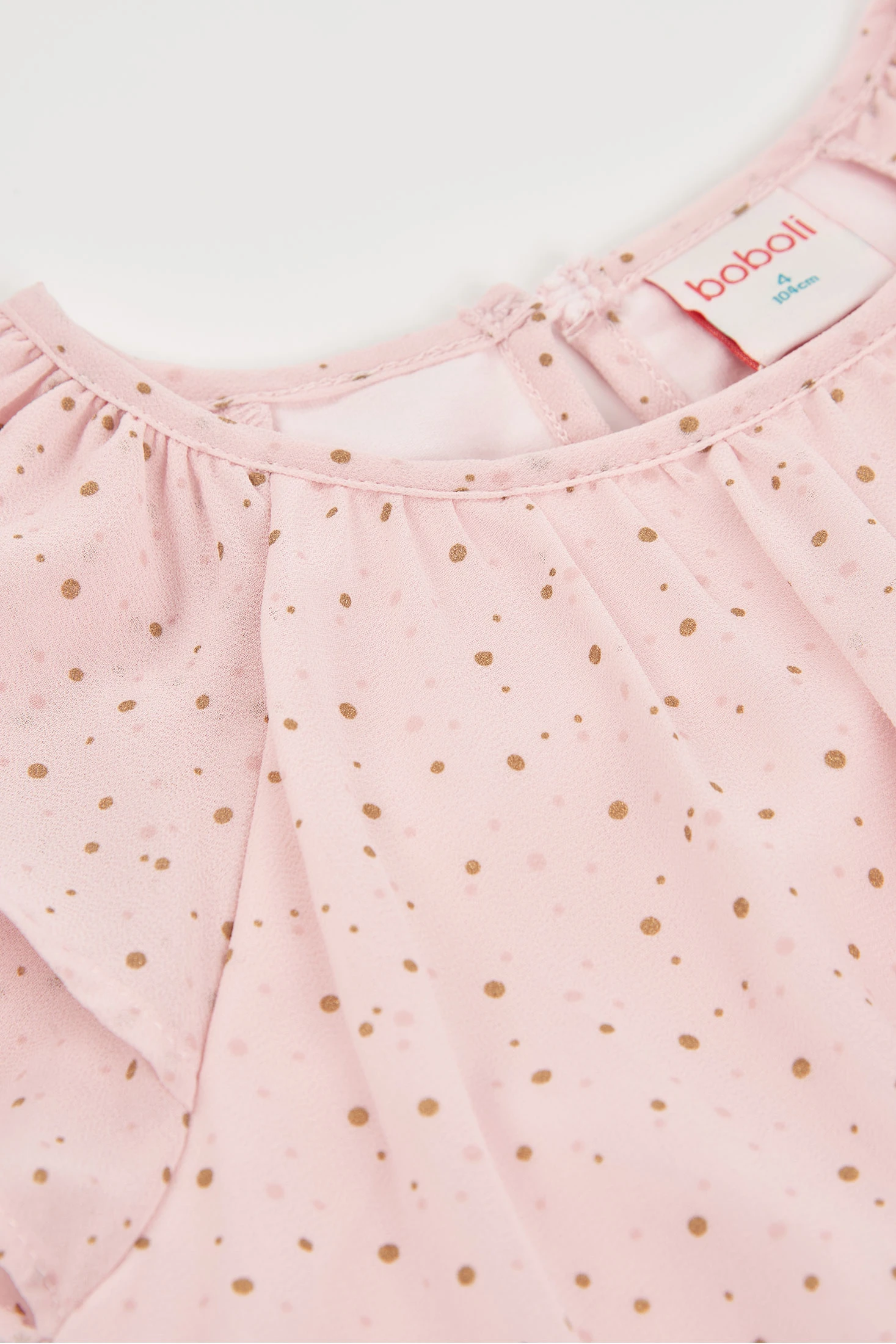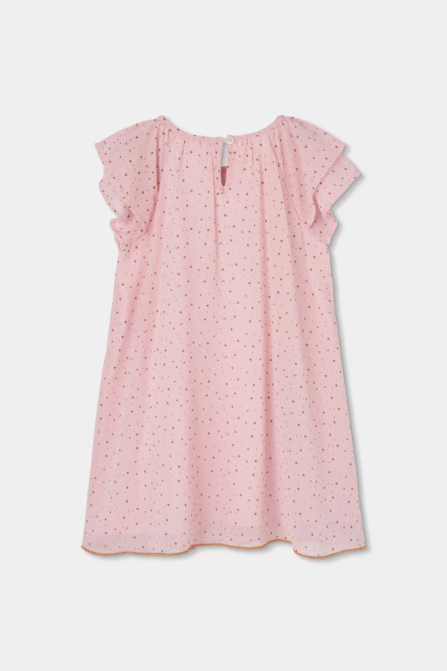 Robe en mousseline imprimée parfaite pour les filles de 12 mois à 10 ans. Son design léger et fluide de couleur rose présente un délicat motif de petits points dorés sur toute la pièce. Les manches courtes avec de légers volants ajoutent une touche d'élégance idéale pour les occasions spéciales. Fabriquée à partir d'un matériau doux et respirant, elle garantit un confort tout au long de la journée. Idéal pour la combiner avec des accessoires simples et créer un look chic en toute saison.