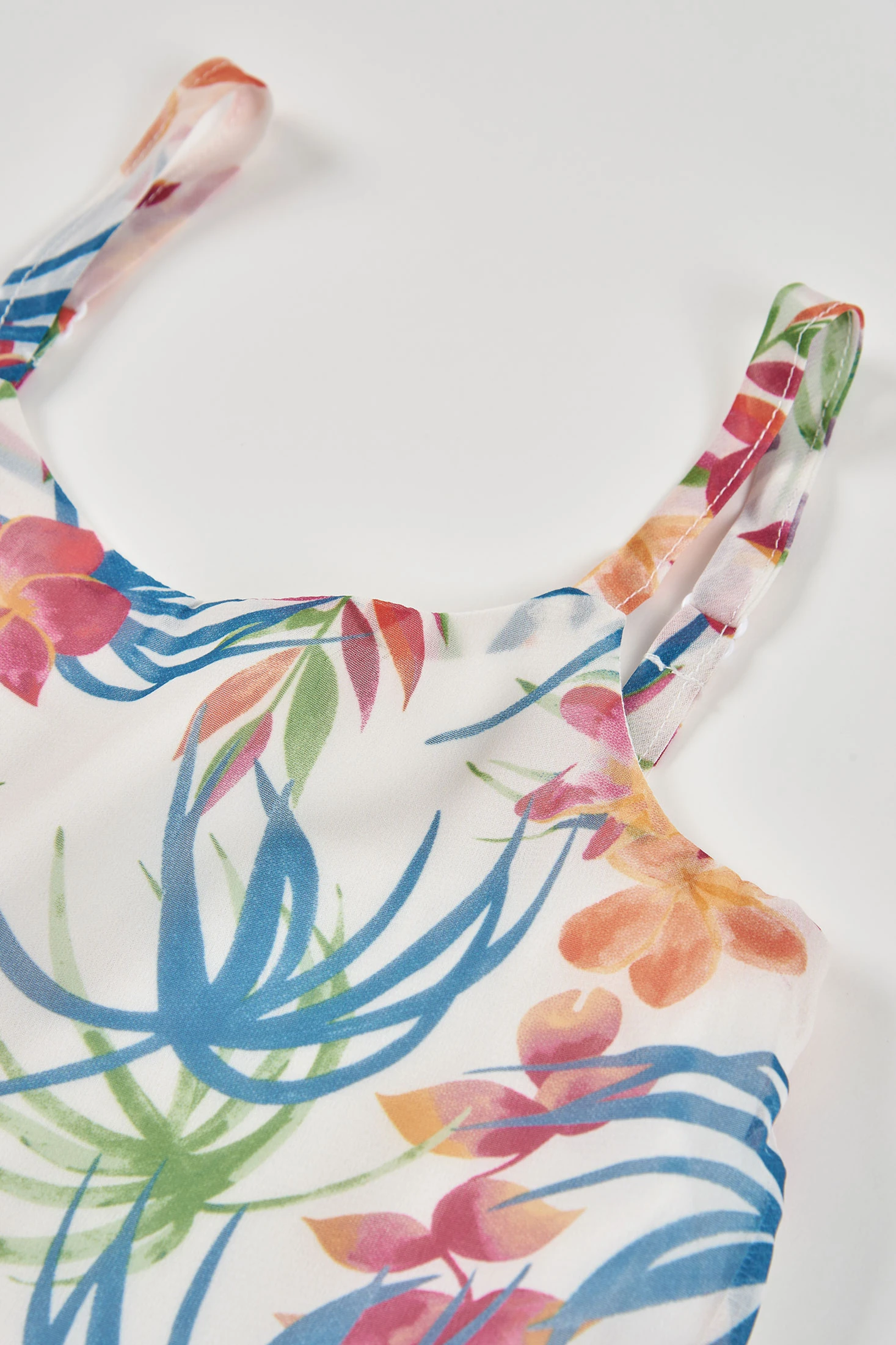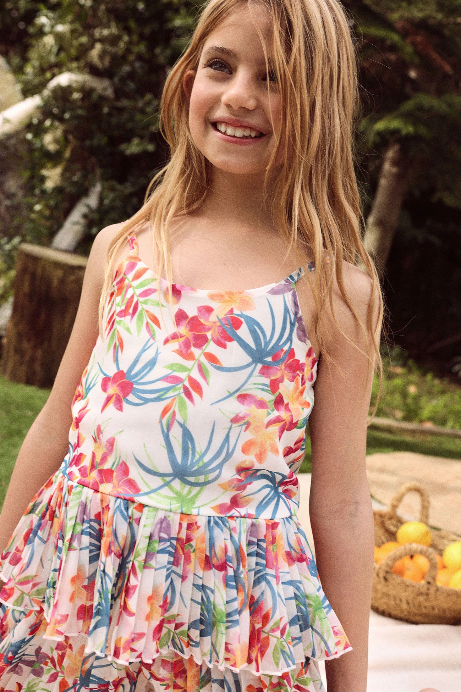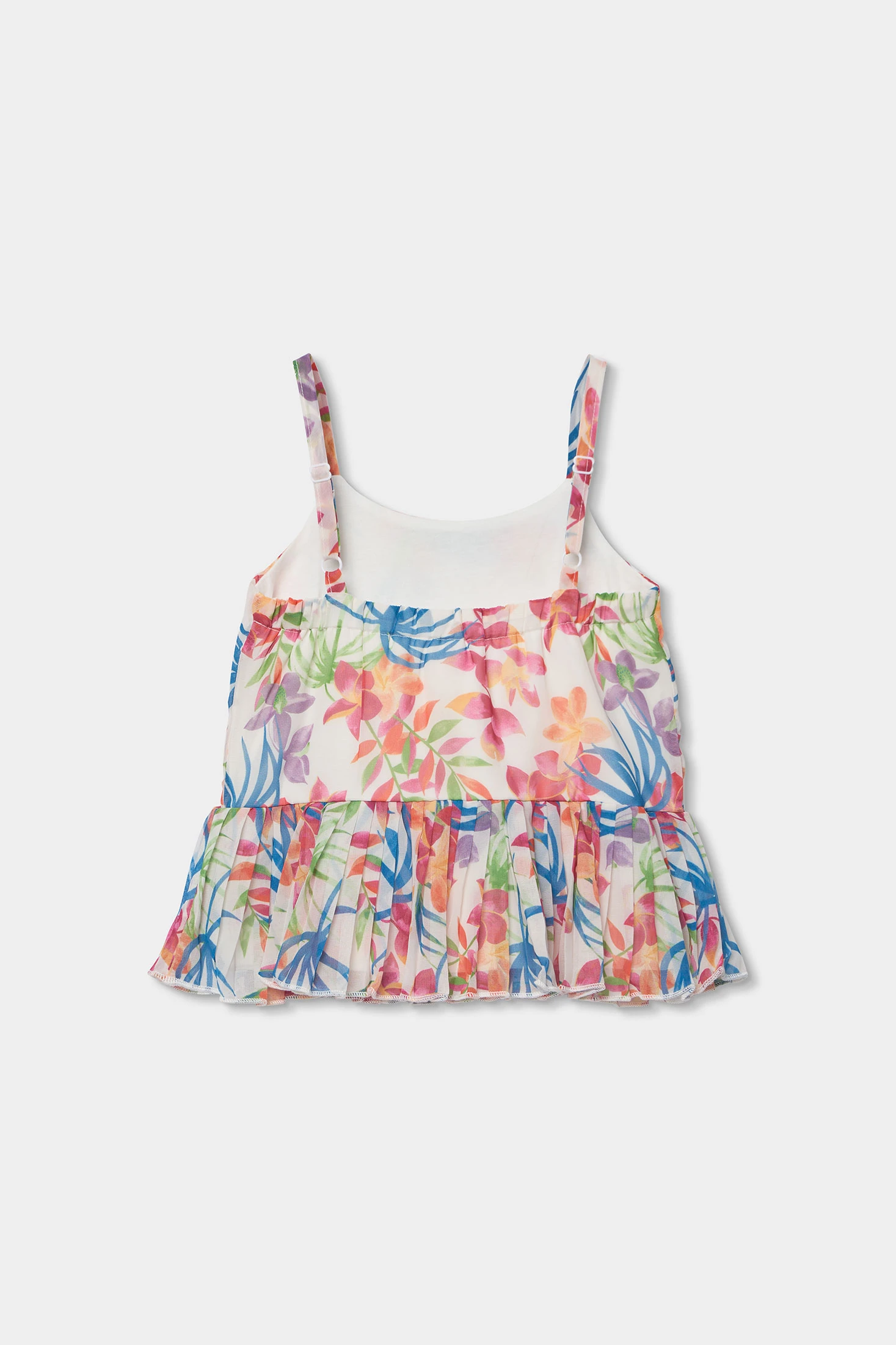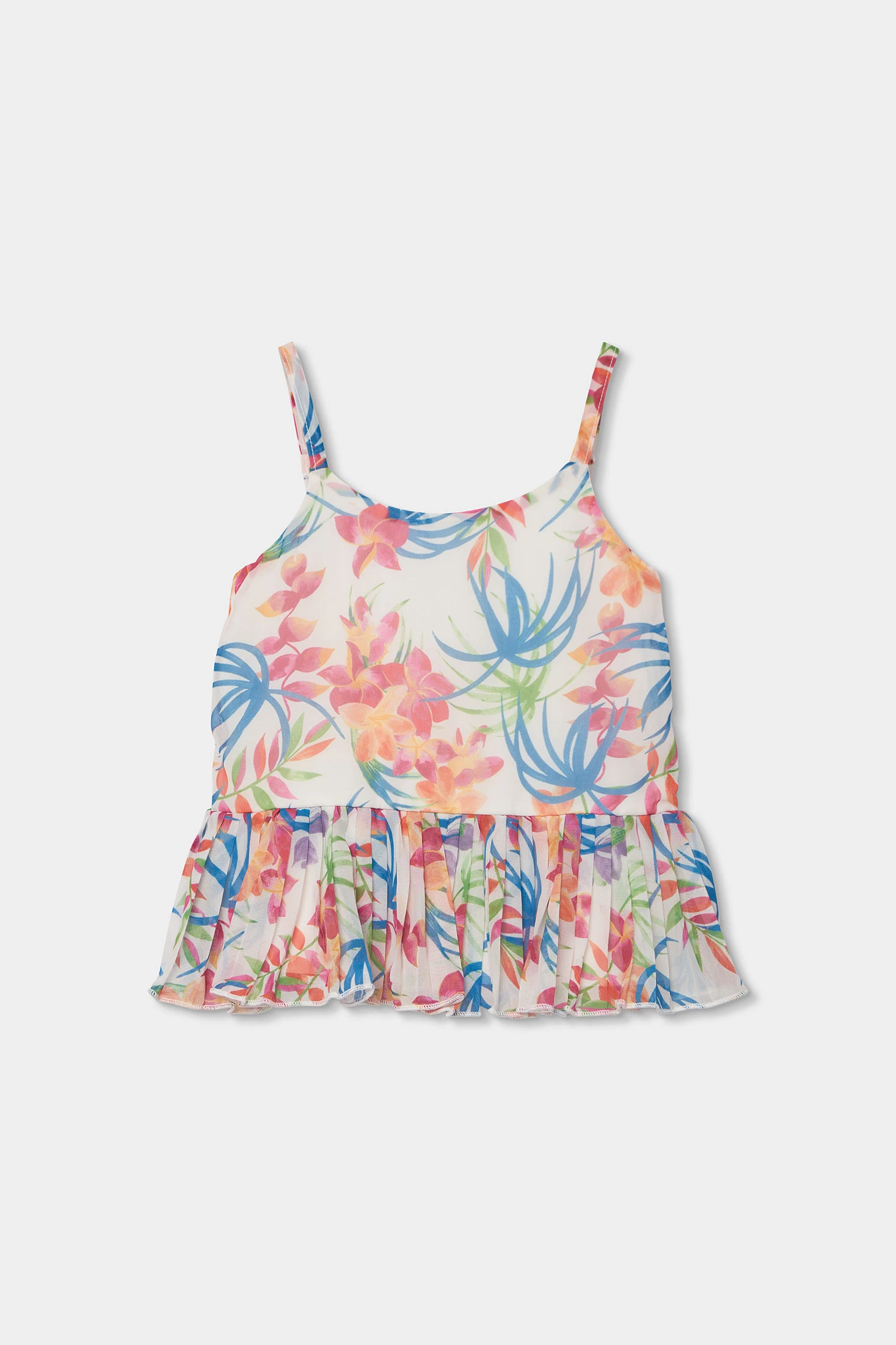 Blouse en mousseline imprimée idéale pour les plus petites, disponible de 2 à 14 ans. Son matériau léger offre confort et fraîcheur. Le design présente un imprimé floral vibrant dans les tons rose, bleu et vert, parfait pour un look joyeux et estival. L'ourlet du vêtement est formé par un volant en mousseline plissée. Les bretelles la rendent idéale pour les journées chaudes, et son ampleur offre une touche romantique. Elle est parfaite pour être assortie avec des jupes ou des pantalons légers, ajoutant une touche chic et colorée au style de chaque fille.