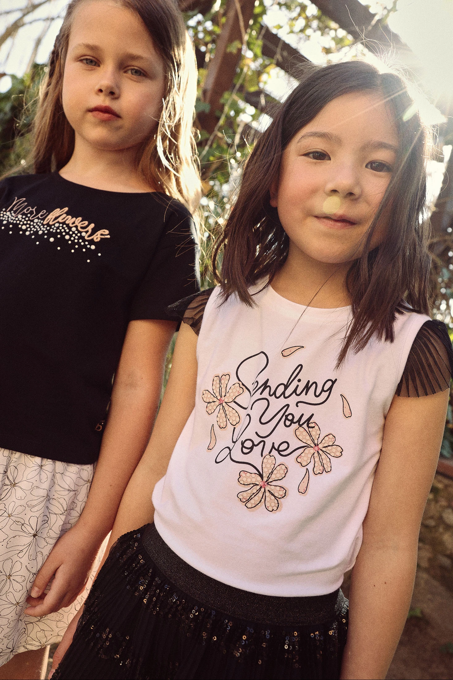T-shirt en coton blanc pour fille, idéale pour le printemps et l'été. Elle présente un design avec un message central entouré de fleurs et des détails en tulle noir sur les épaules, apportant une touche élégante. Son tissu en coton assure fraîcheur et confort. Disponible en tailles de 2 à 14 ans. Se marie facilement avec des jeans ou des jupes, parfaite pour un look décontracté et chic.