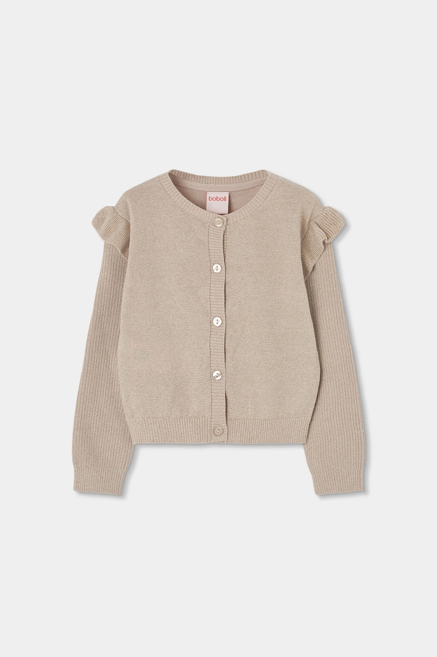 Veste en maille pour fille idéale pour les saisons d'automne et d'hiver. Confectionnée dans un tissu doux, elle offre confort et chaleur. Le design de couleur beige la rend polyvalente et facile à assortir avec d'autres vêtements. Elle présente un col rond et des boutons à l'avant, ce qui facilite son utilisation. Les détails à volants sur les épaules ajoutent une touche d'élégance. Disponible dans les tailles allant de 2 à 14 ans. Elle est parfaite pour ajouter une touche chic à toute tenue quotidienne.