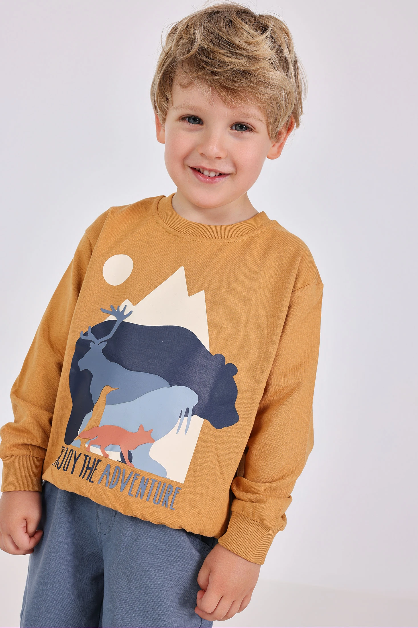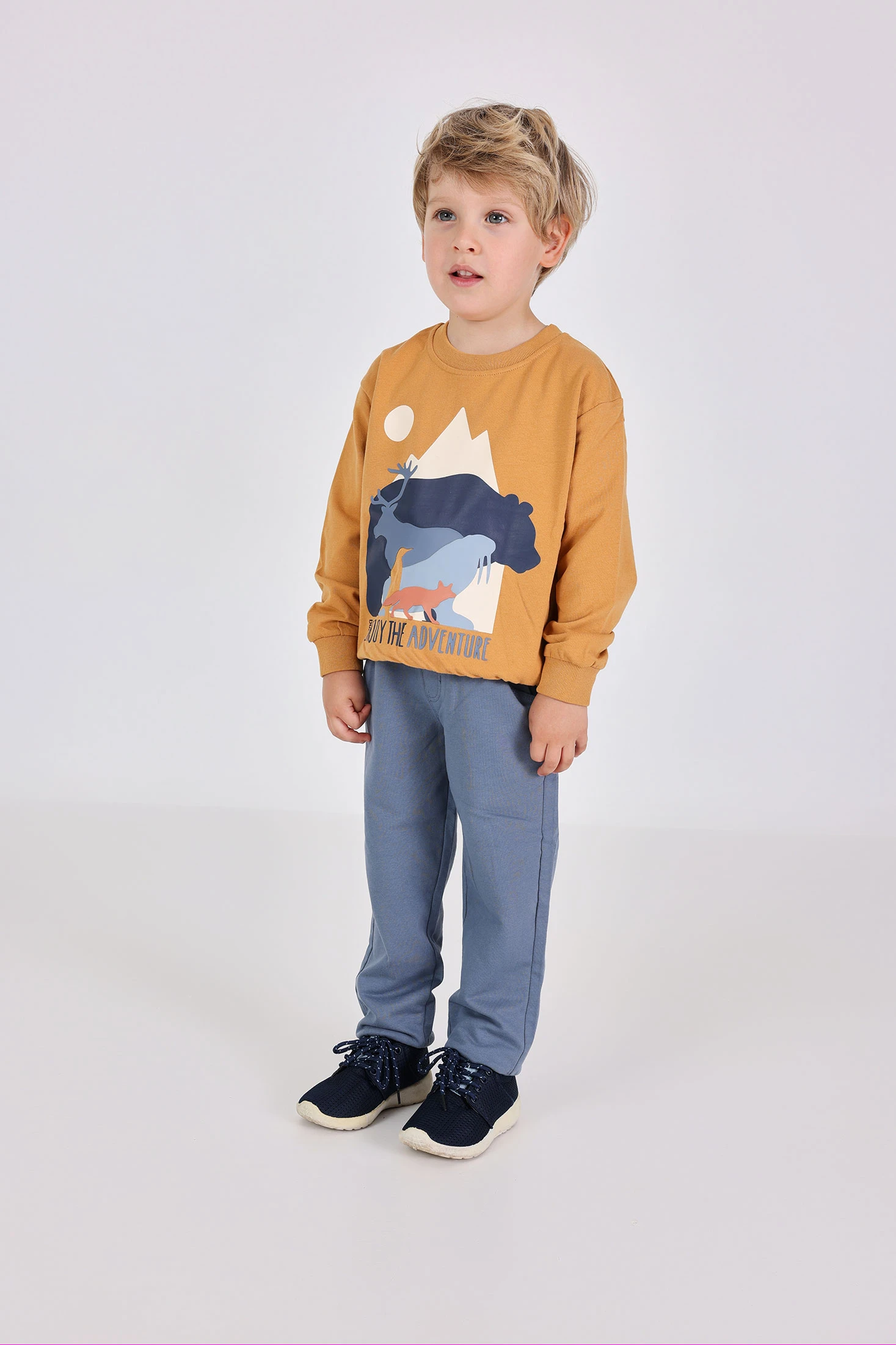 Ensemble en tricot de couleur jaune, idéal pour les enfants pendant la saison automne-hiver. Le design paysager sur la sweatshirt ajoute une touche ludique et originale, tandis que les matériaux doux assurent un confort maximal. Comprend un pantalon qui offre une liberté de mouvement et est disponible en tailles pour les âges de 12 mois à 10 ans. Parfait pour se combiner avec des bottes ou des baskets, créant un look chaud et moderne pour les aventures quotidiennes des plus petits.