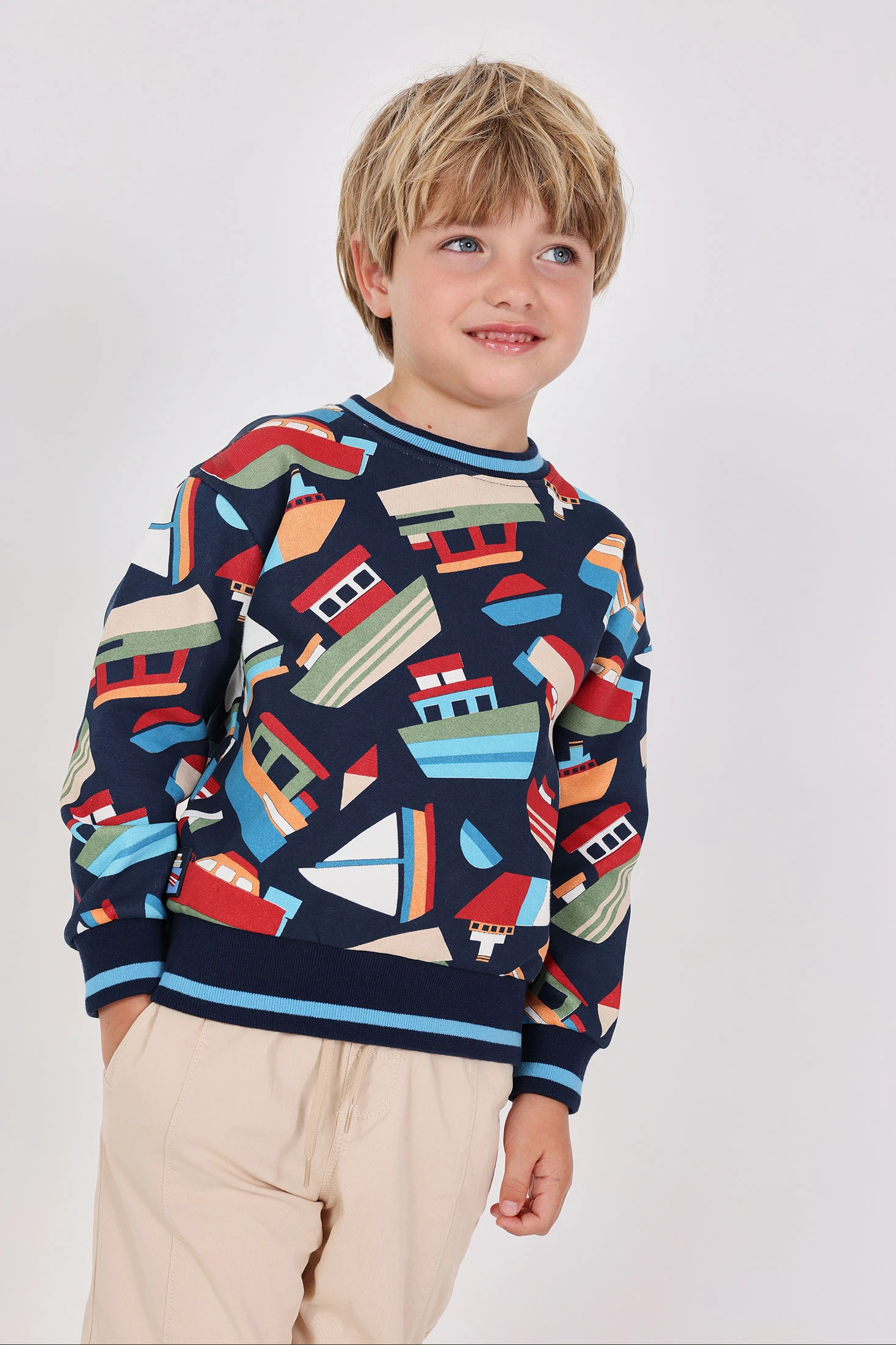 Sweat-shirt en molleton bleu avec imprimé de bateaux, indispensable pour apporter chaleur et confort à la garde-robe infantile. Confectionnée dans un tissu doux qui protège la peau sensible du bébé, elle offre liberté de mouvement et un ajustement confortable. Disponible en tailles de 12 mois à 10 ans, c'est une option polyvalente adaptée à toutes les saisons. Sa teinte bleue classique facilite son association avec des pantalons et des jupes, créant des ensembles modernes et pratiques. Idéal pour compléter la garde-robe quotidienne avec une touche de style et de fonctionnalité.