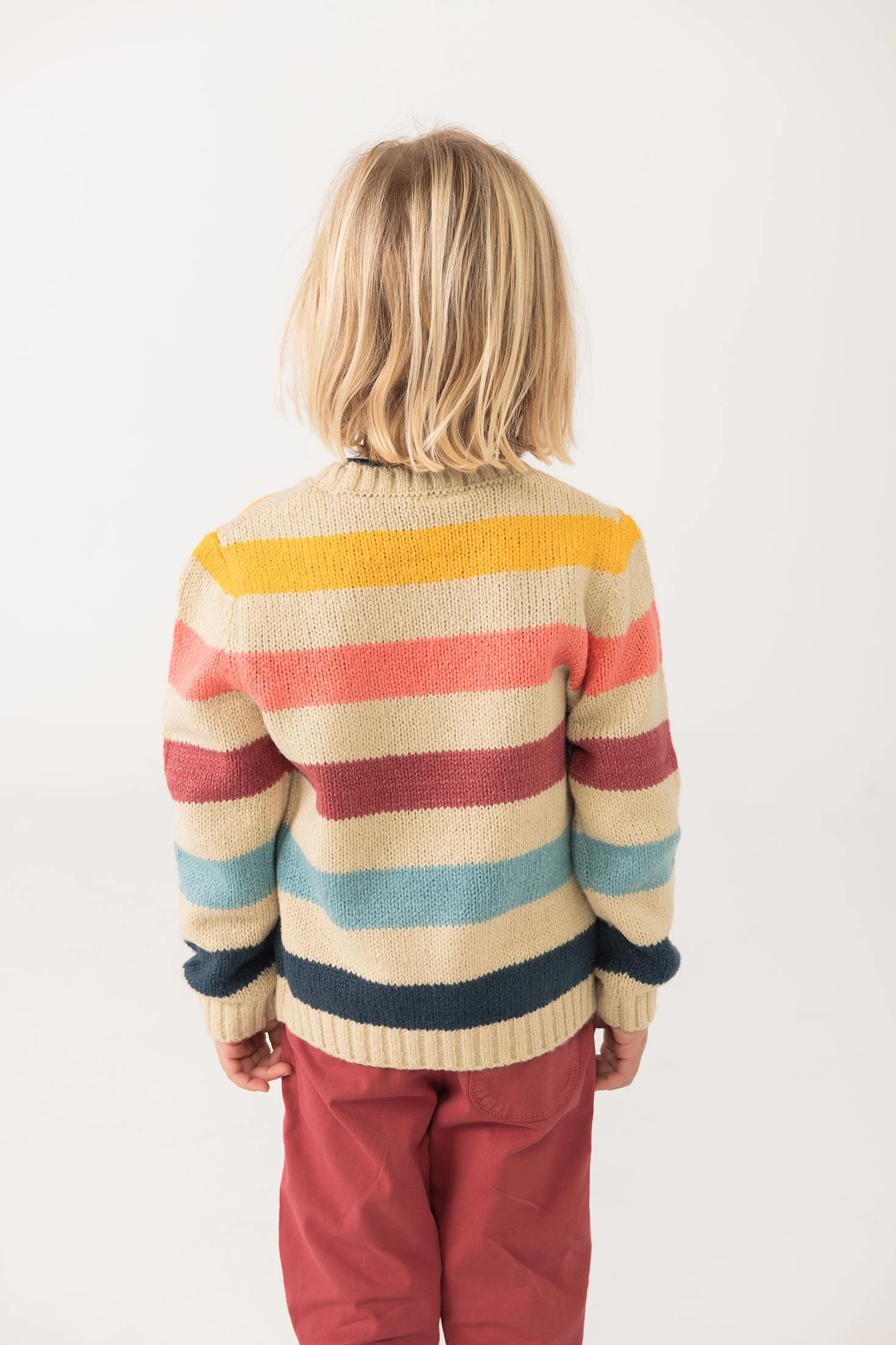 Pull pour enfant confectionné en tricot avec des rayures dans des tons beige, conçu pour garder les petits au chaud pendant l'automne et l'hiver. Design classique et élégant avec col rond et manches longues, en faisant un vêtement essentiel pour les jours froids. Fabriqué en tricot doux, il offre confort et chaleur, assurant le bien-être de l'enfant. Disponible en tailles de 12 mois à 10 ans, c'est une option parfaite pour assortir avec des pantalons ou des vestes dans une tenue chic et confortable.