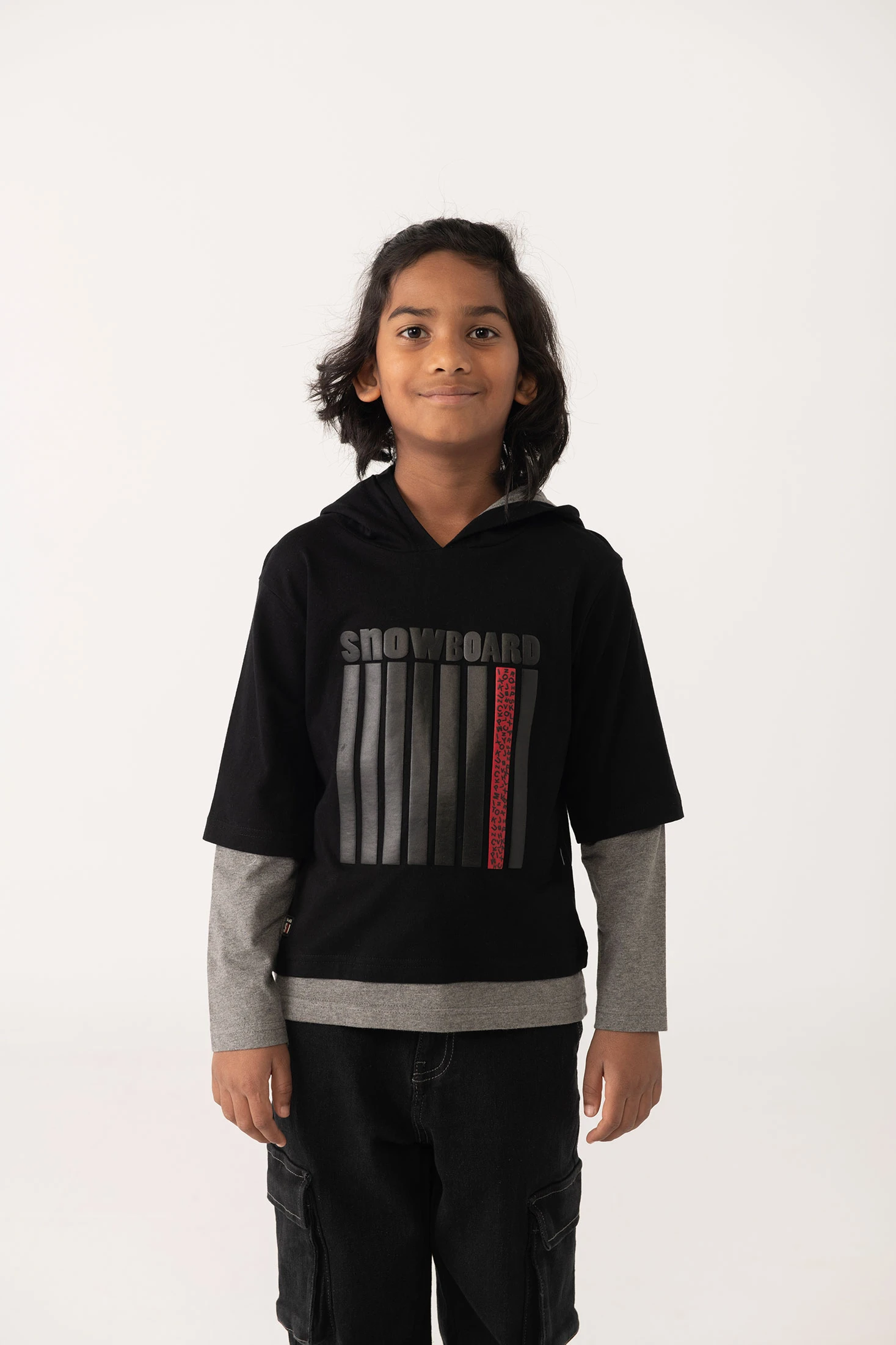 T-shirt en coton de couleur noire combinée avec du gris pour enfants, confectionnée en coton doux de haute qualité, garantissant confort et respirabilité tout au long de l'année. Son design simple et classique facilite sa combinaison avec des jeans, des shorts ou même sous un pull lors des journées plus fraîches. Disponible en tailles allant de 2 à 14 ans, ce t-shirt est un vêtement basique et essentiel dans la garde-robe des enfants. Idéal aussi bien pour un usage quotidien que pour des occasions plus formelles, il se présente comme une option polyvalente pour compléter n'importe quelle tenue.