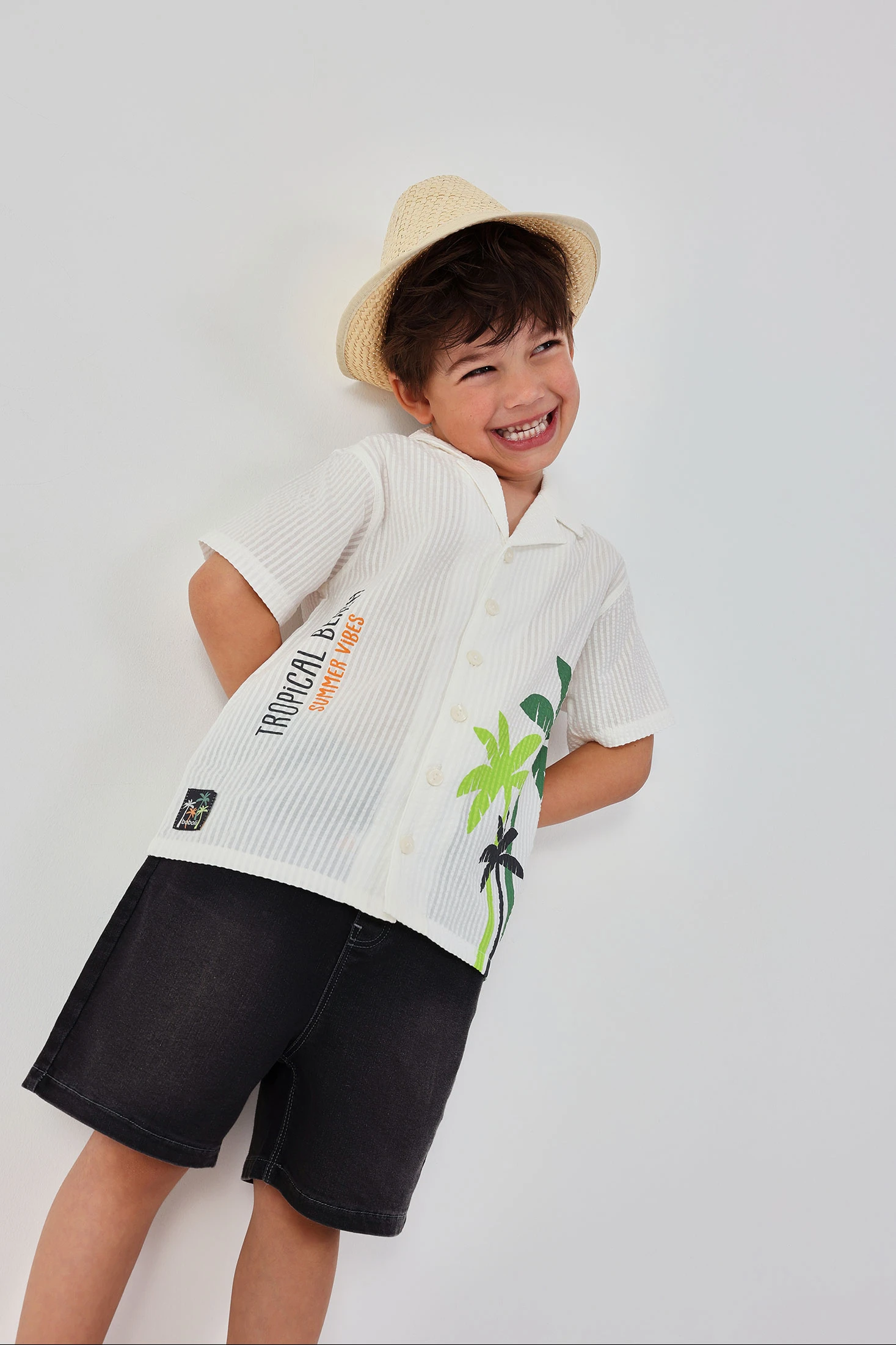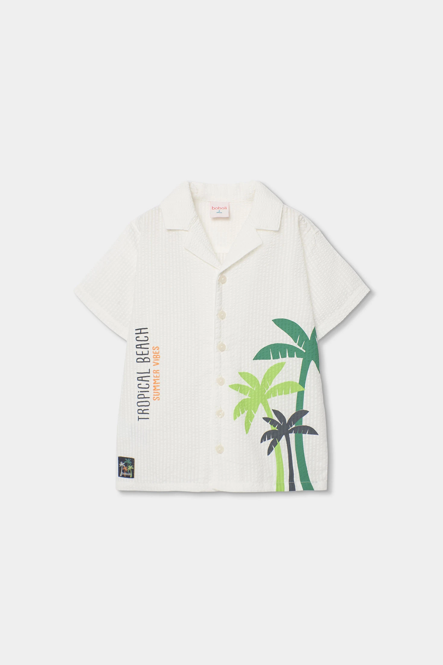 Chemise en popeline pour garçon, idéale pour un look frais et estival. Son tissu léger en seersucker est parfait pour les journées les plus chaudes. De couleur blanche, elle présente un motif de palmiers et de lettres qui lui confère une touche tropicale et moderne. Elle possède un col classique et une fermeture à boutons. Disponible en tailles de 12 mois à 10 ans, c'est un vêtement polyvalent qui se marie facilement avec des shorts ou des jeans pour un style décontracté et tendance.