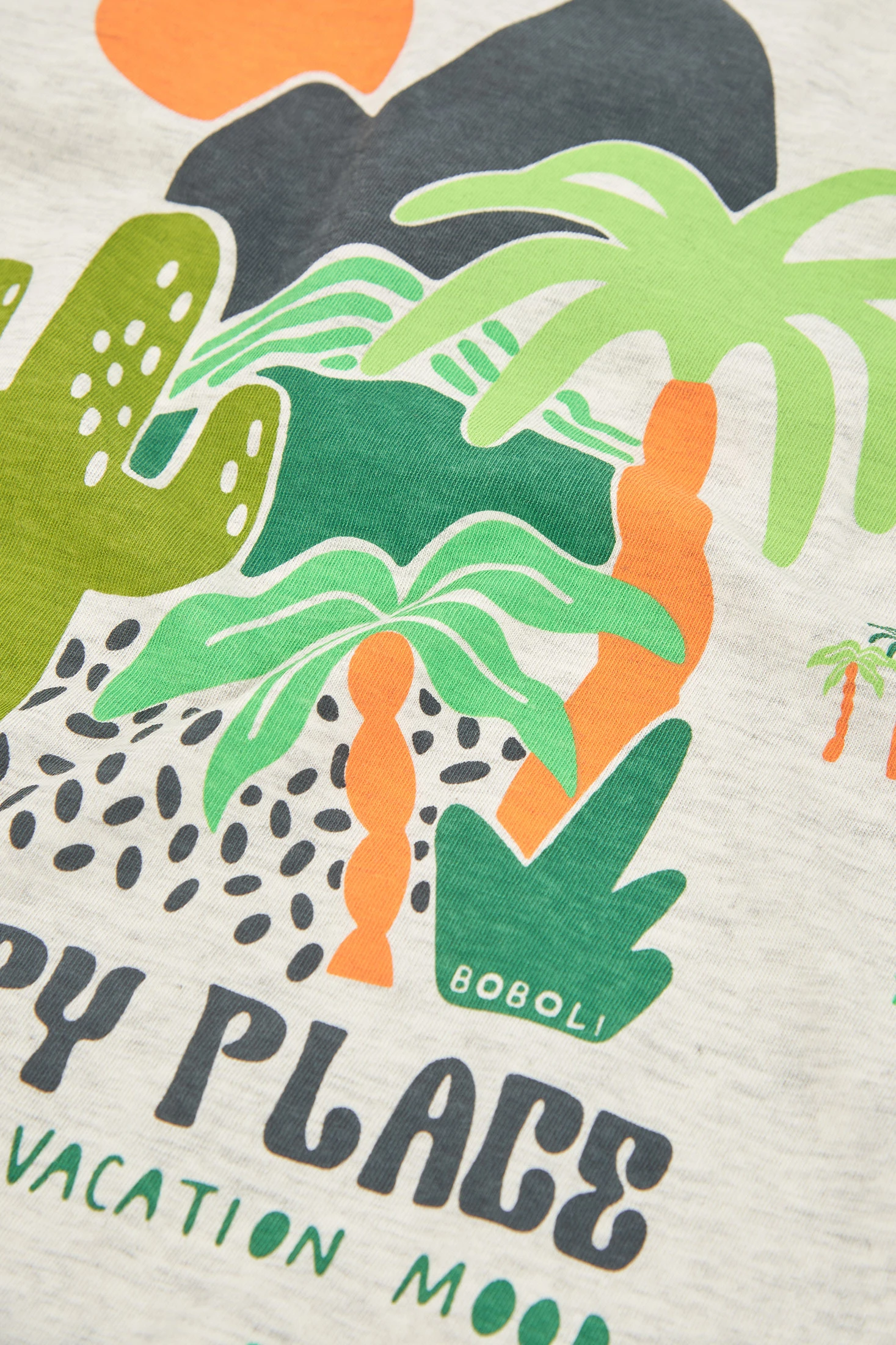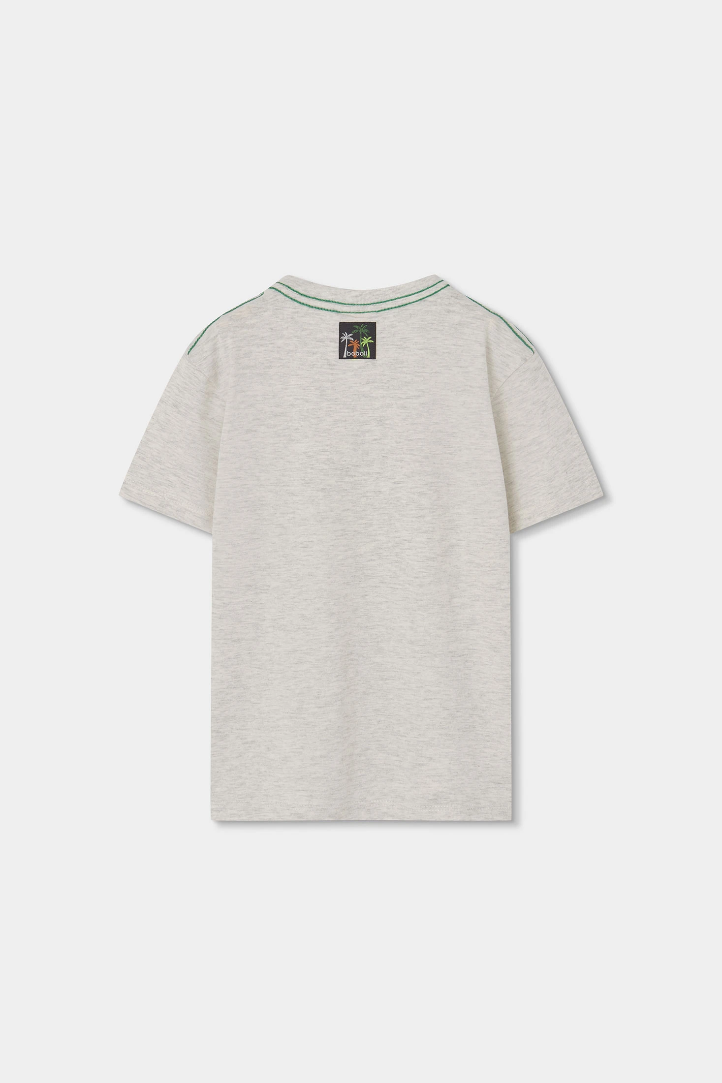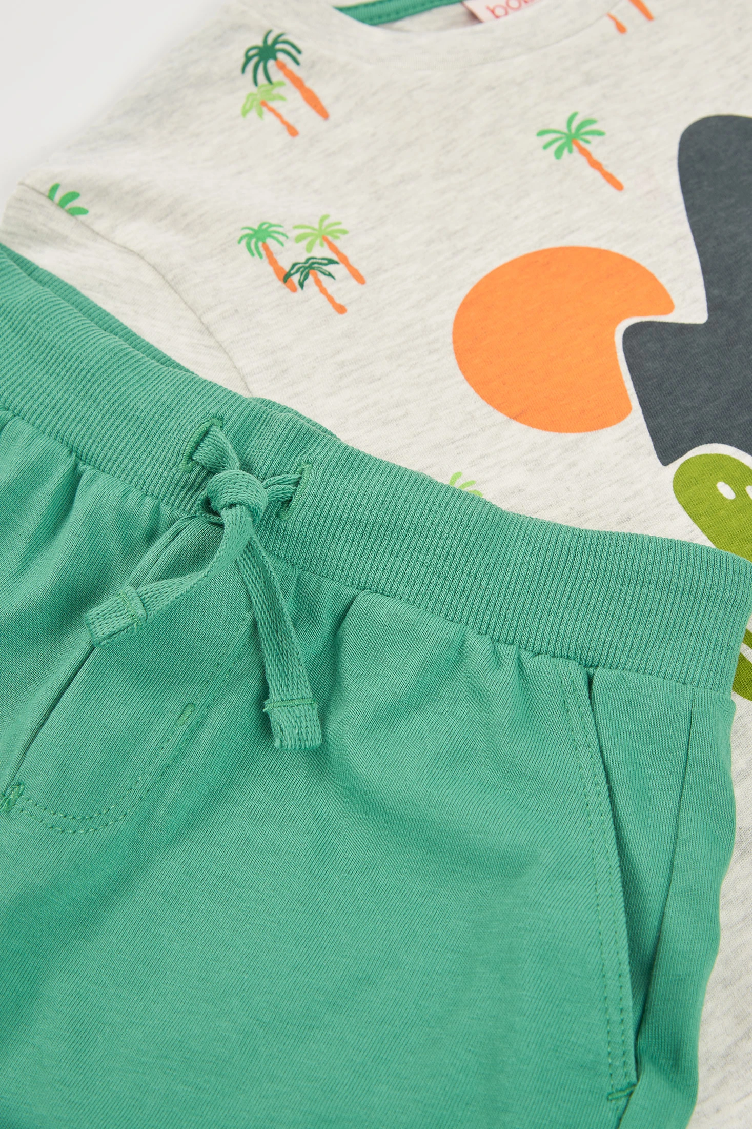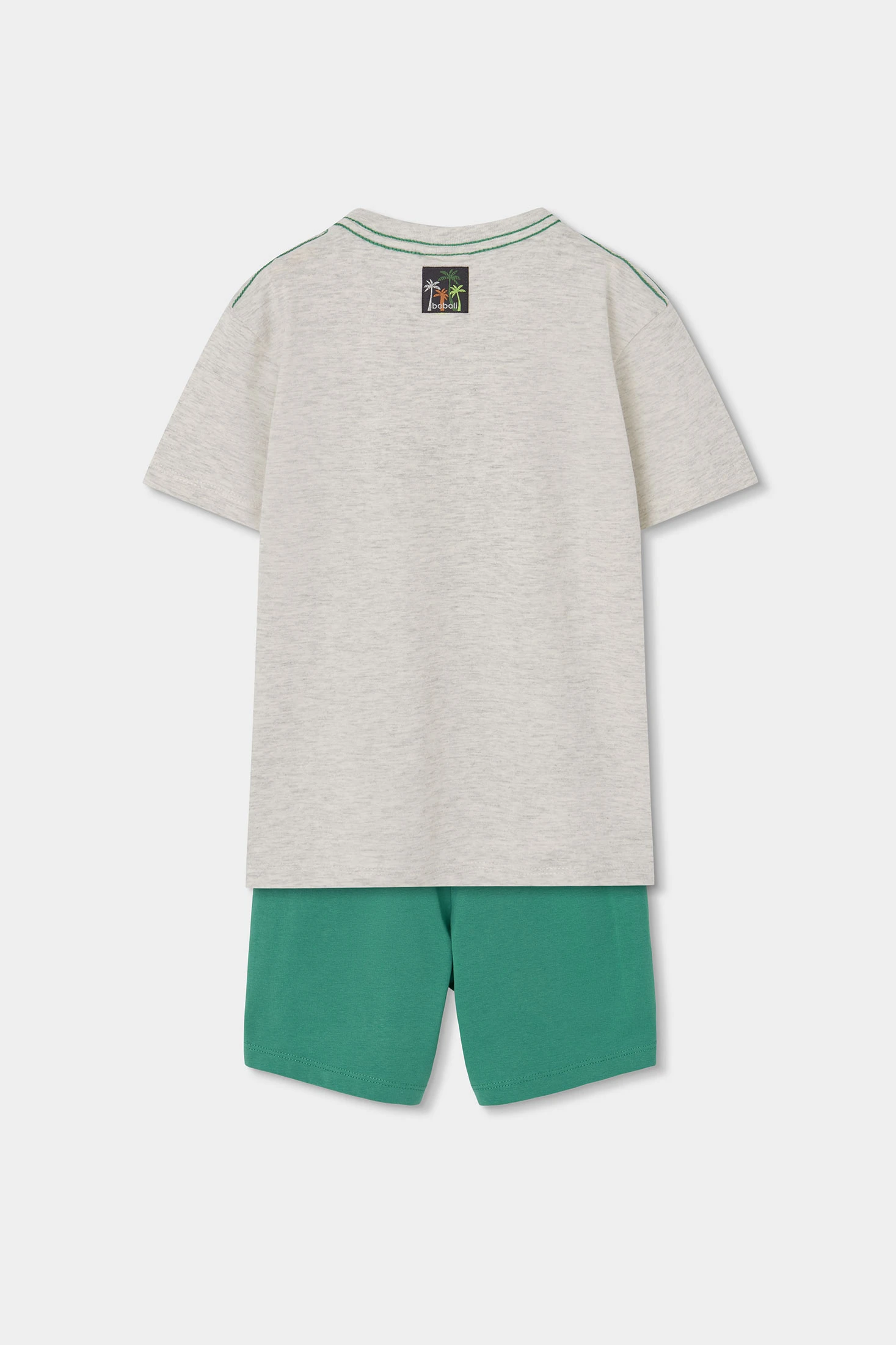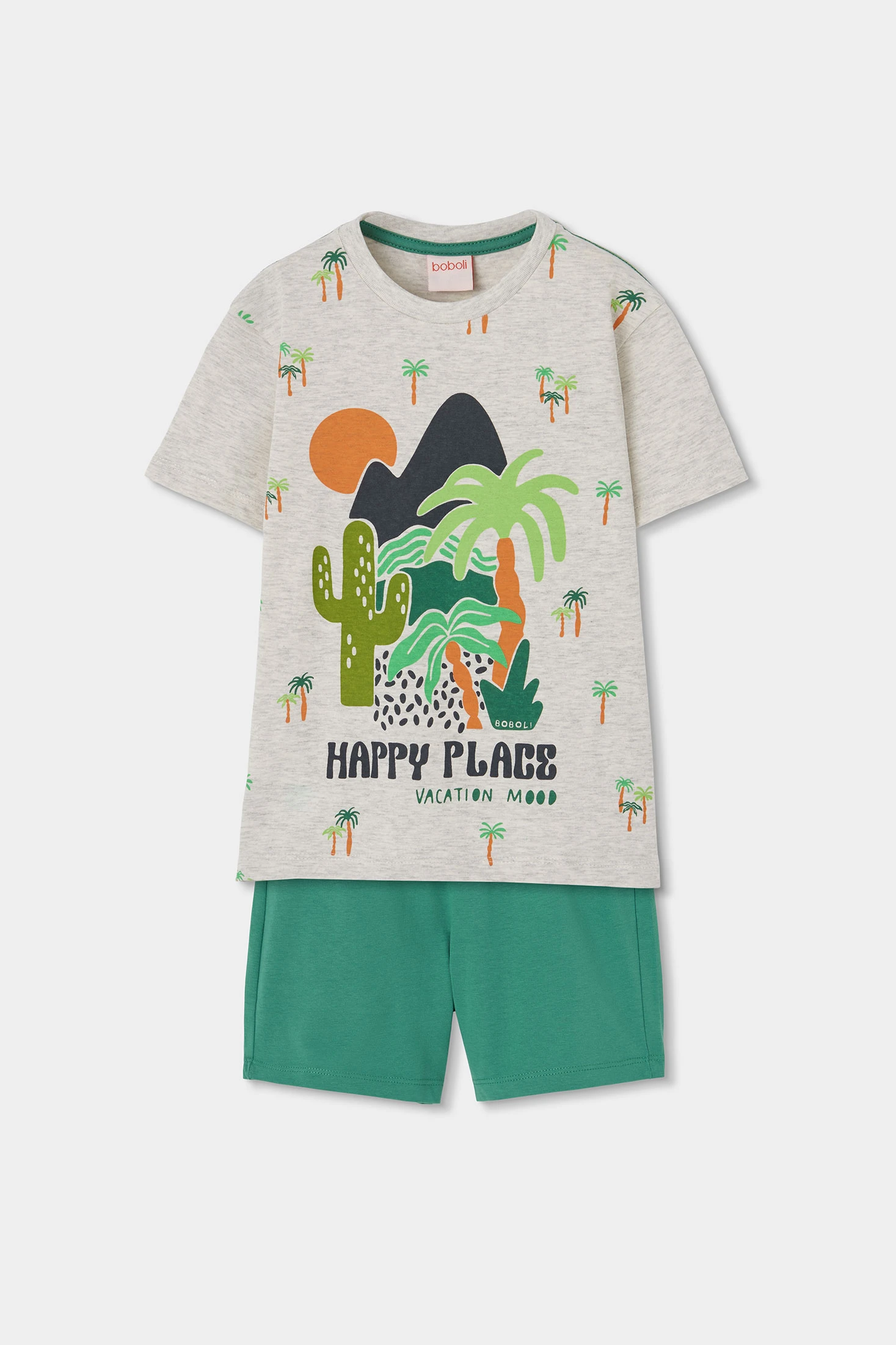Ensemble pour garçon qui comprend un t-shirt et un short. Le t-shirt est à manches courtes en couleur écru chiné avec un grand imprimé tropical et coloré. Le short est de couleur verte avec une taille élastique et un cordon ajustable, assurant un ajustement parfait. Le tissu en maille garantit un confort pour explorer en toute liberté. Disponible en tailles de 12 mois à 10 ans, cet ensemble est idéal pour les journées chaudes. Son design joyeux le rend parfait pour les activités de plein air et garantit style et confort durant toute aventure.