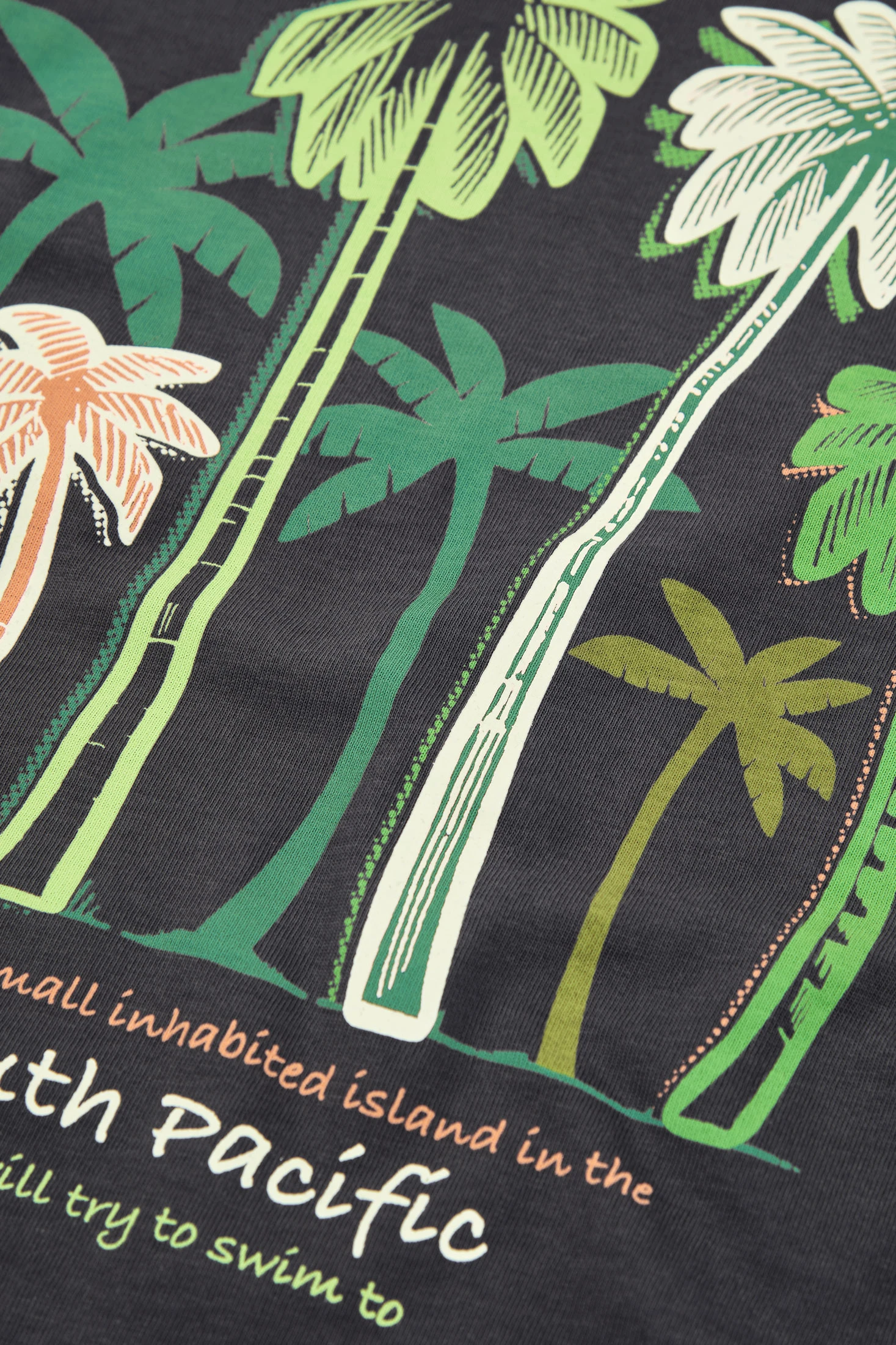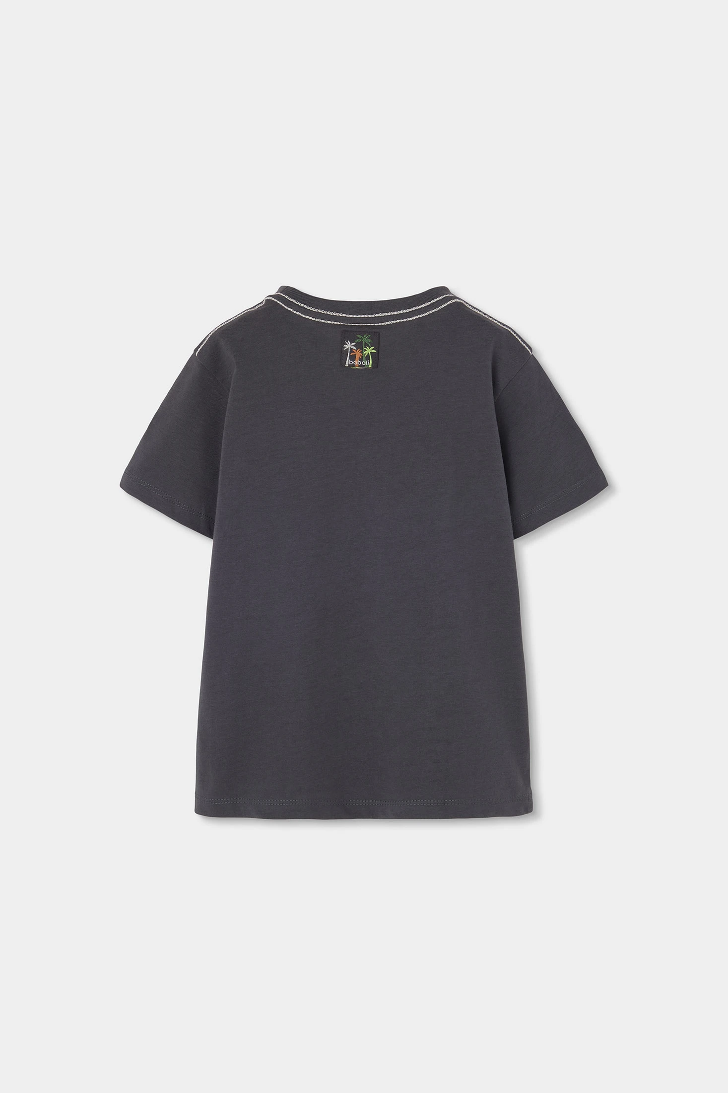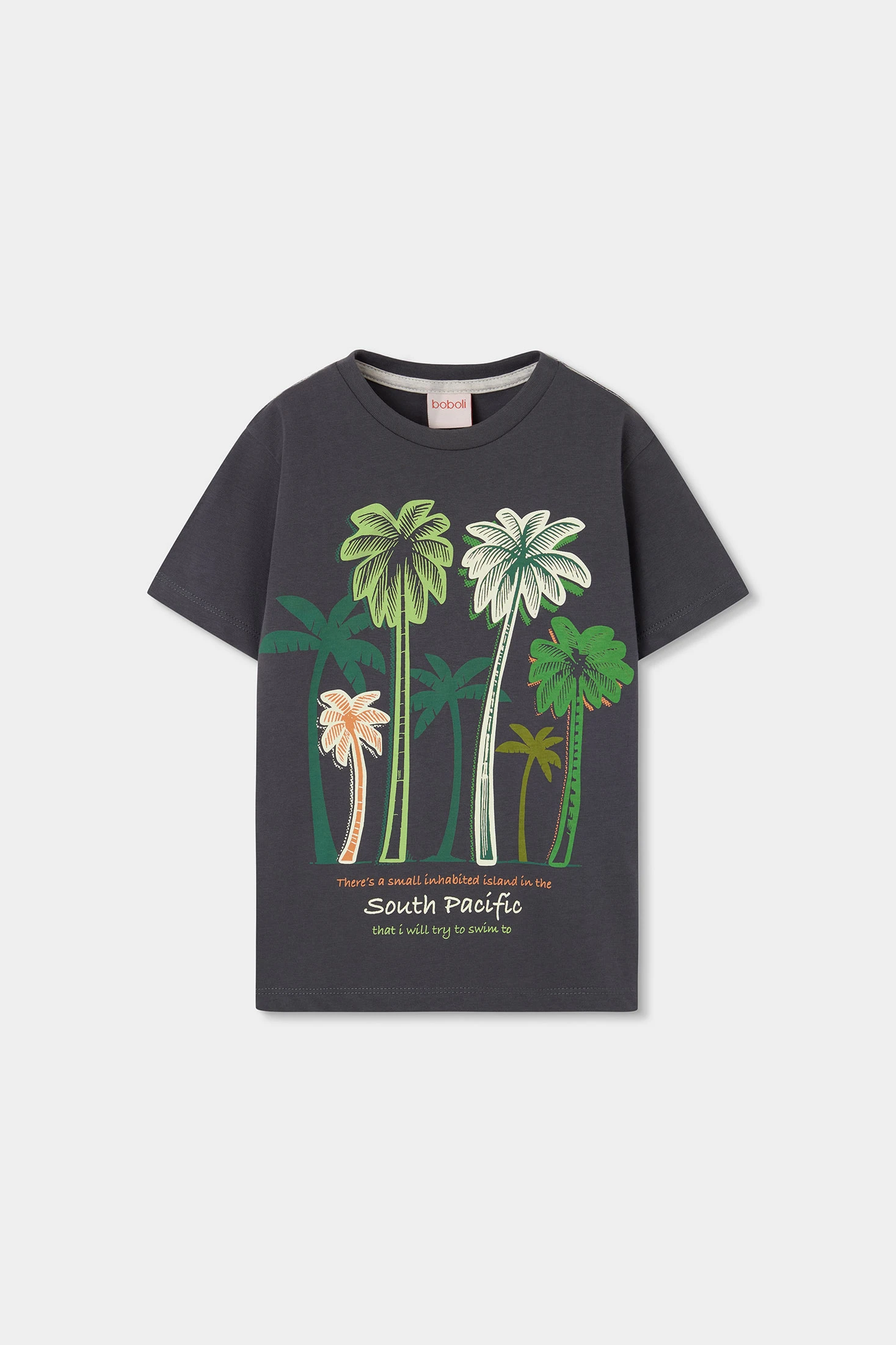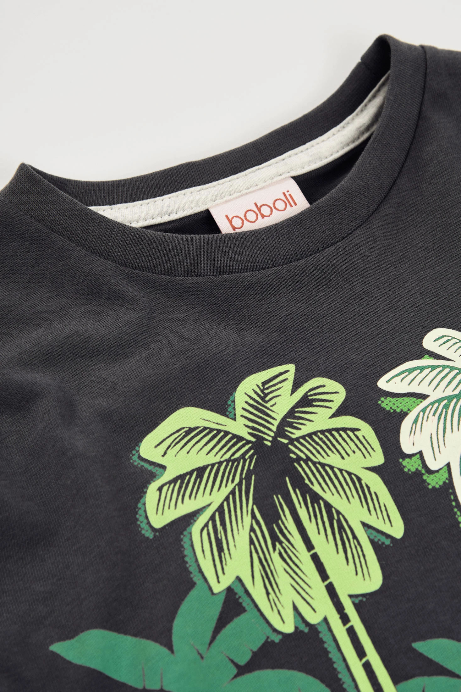 T-shirt en coton gris anthracite pour garçon, idéale pour un usage quotidien grâce à son design confortable et frais. Elle présente un imprimé de palmiers dans des tons verts et oranges, ajoutant une touche amusante et tropicale. Le tissu en coton offre douceur et confort. Disponible en tailles de 12 mois à 10 ans, elle offre polyvalence et style. Associez-la avec des shorts ou des jeans pour un look décontracté et moderne. Une option pratique pour toute occasion.