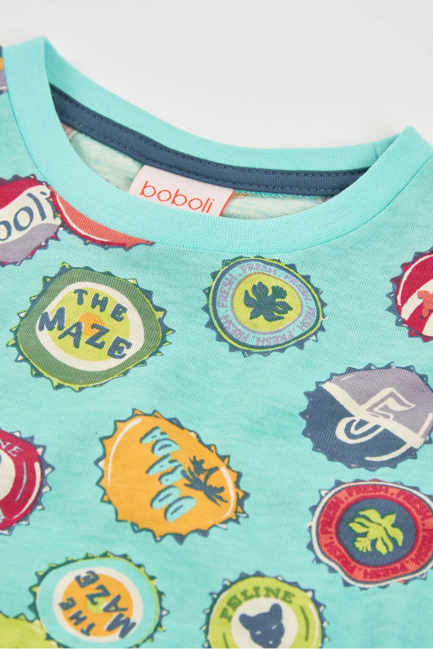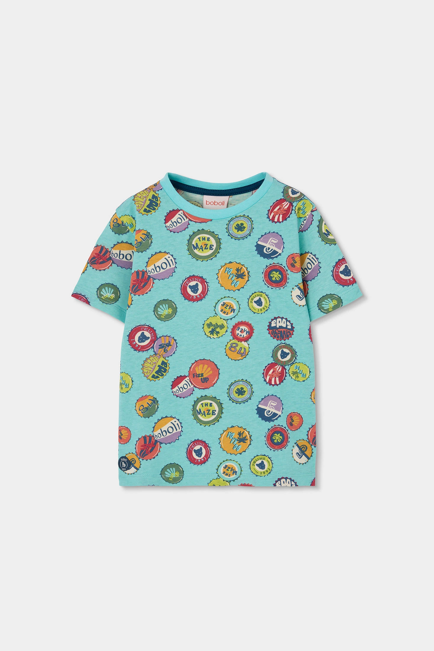 T-shirt en coton imprimé pour garçon idéale pour les plus petits. Disponible de 12 mois à 10 ans, elle s'adapte à la croissance de votre enfant. Son design présente des imprimés colorés de badges et de logos sur un fond bleu clair, ajoutant une touche amusante et moderne. Le matériel en coton assure confort et douceur pour un usage quotidien. Avec un col rond et des manches courtes, c'est un vêtement polyvalent qui se combine facilement avec des jeans ou des shorts, permettant à votre petit de paraître frais et à la mode.
