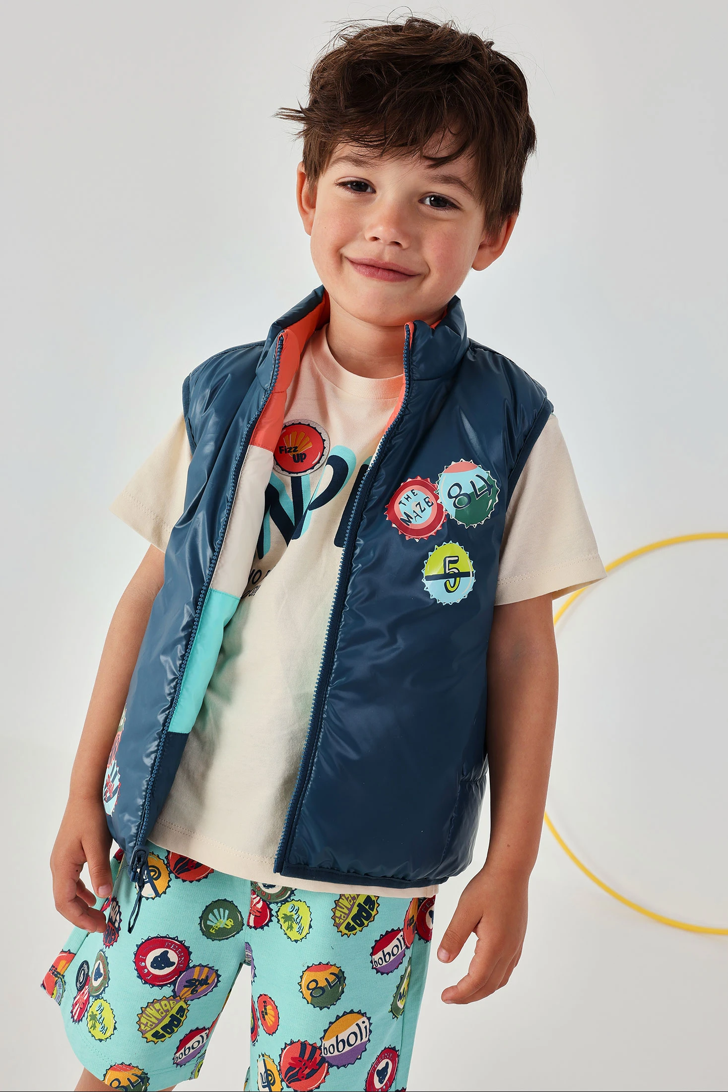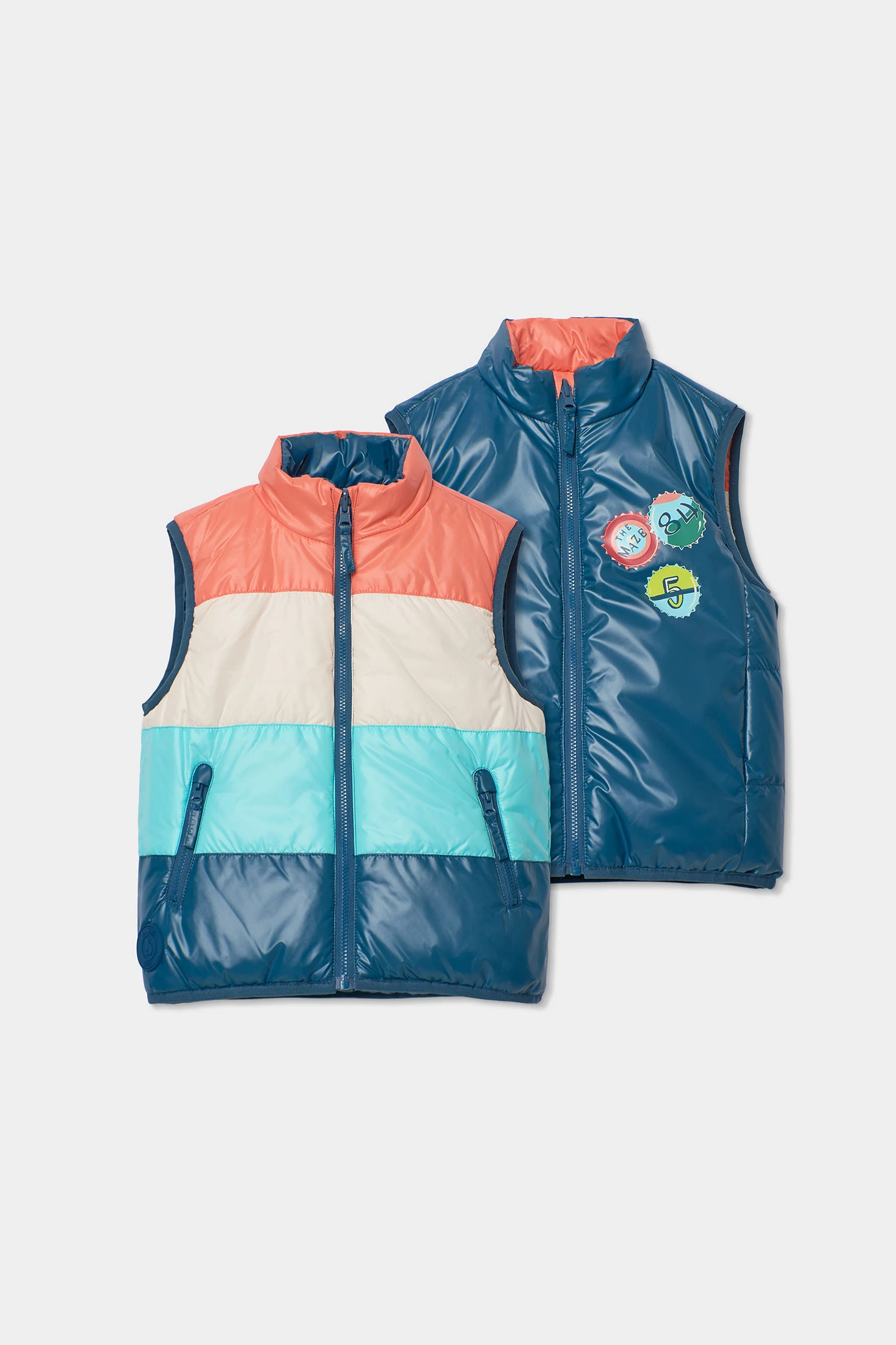 Gilet réversible pour enfant confectionné en tissu technique, parfait pour la mi-saison. De couleur bleu foncé verdâtre d'un côté, et multicolore de l'autre. Offre un design attrayant et amusant. Inclut des détails graphiques de plaques qui ajoutent une touche originale. Conçu pour les âges de 12 mois à 10 ans, c'est un vêtement polyvalent et fonctionnel. Conçu pour offrir confort et chaleur, il peut être assorti à des t-shirts ou des pulls pour un style décontracté et moderne. Idéal pour les aventures en plein air durant les journées fraîches.