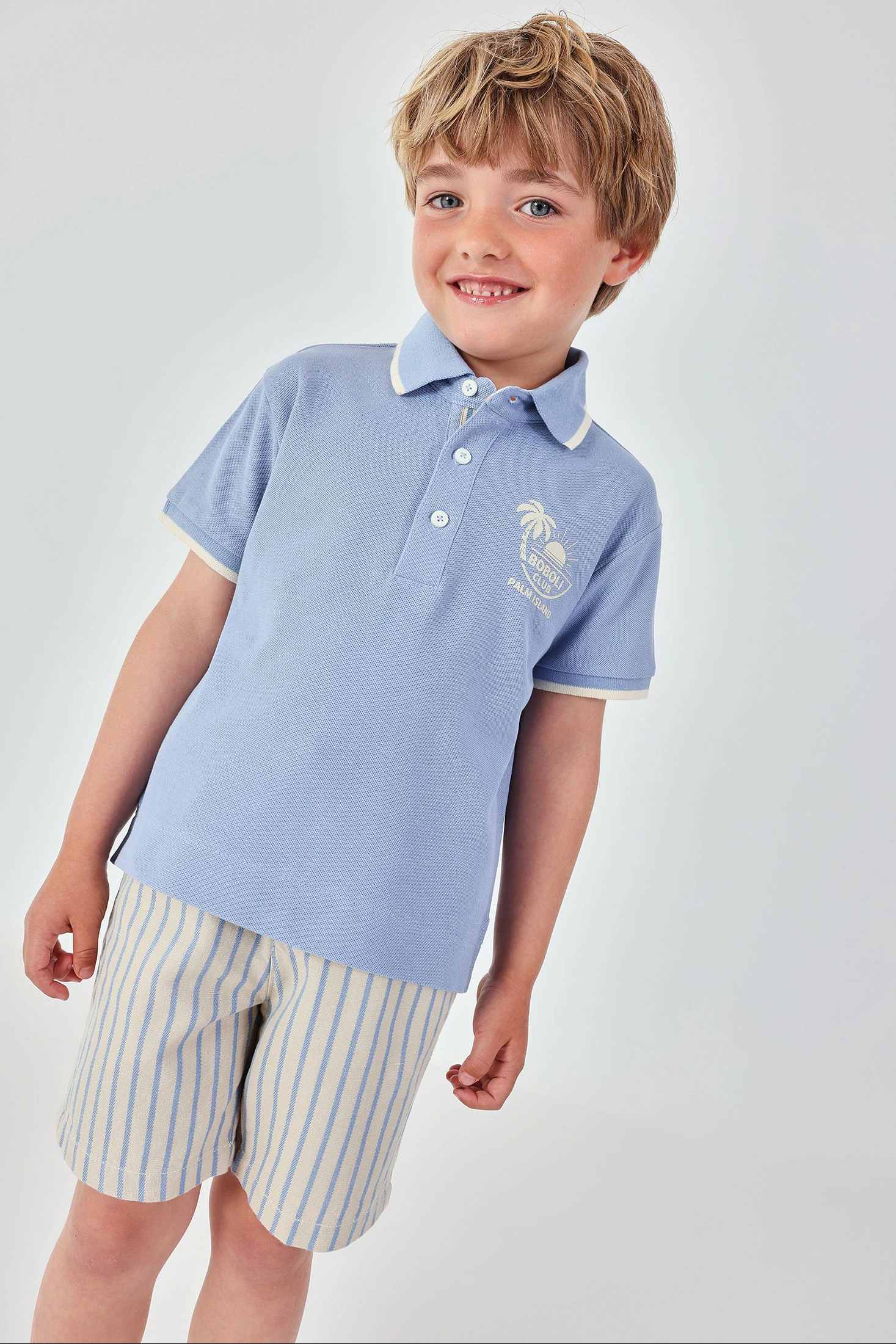 Polo en piqué bleu et beige, parfait pour les plus petits, offrant fraîcheur et confort pour l'été. Le design présente des détails subtils et une couleur élégante qui permet de les associer facilement avec d'autres vêtements. Disponibles en tailles pour bébés et enfants de 12 mois à 10 ans. Idéal pour un look décontracté et confortable, gardant votre enfant frais et stylé pendant les journées les plus chaudes.