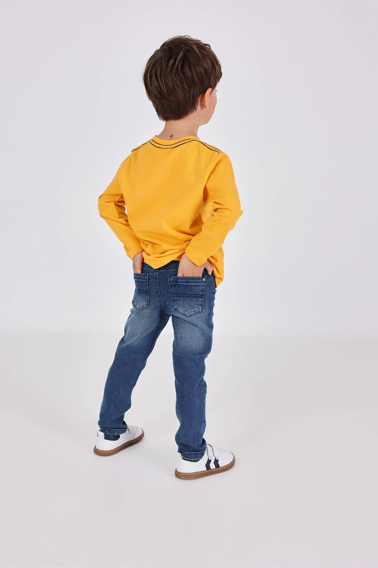 Pantalon en denim stretch bleu pour garçon, se ferme par bouton-pression, ceinture avec oeillets élastiques et bouton intérieur. La décoration est une étiquette avec les détails de la marque. A partir de la taille 18 mois, la braguette se ferme avec une fermeture éclair. Ce vêtement est fini pour lui donner un aspect plus ancien. Disponible en tailles de 6 mois à 6 ans