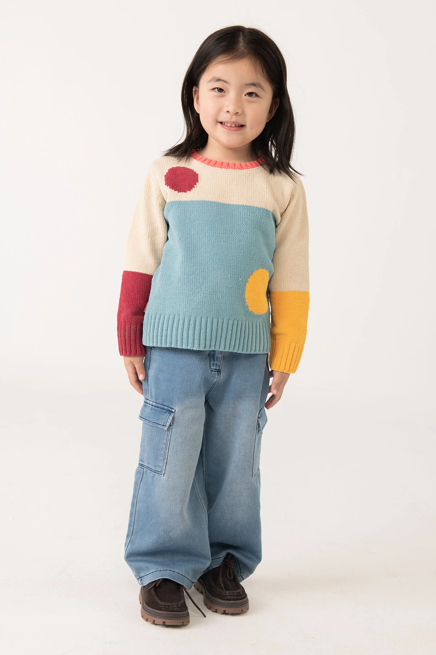 Pull en maille pour fille de couleur beige, conçu pour la saison d'automne et d'hiver, présente des cercles contrastants en bleu, rouge et moutarde qui ajoutent une touche amusante et moderne à la garde-robe des enfants. Il dispose de manches longues pour offrir de la chaleur, et son matériau en maille douce assure flexibilité et confort tout au long de la journée. Disponible en tailles de 12 mois à 10 ans, il est idéal pour garder les enfants au chaud pendant les jours froids. Il peut être magnifiquement assorti avec des pantalons ou des jupes pour un style décontracté et joyeux, parfait pour toute occasion.