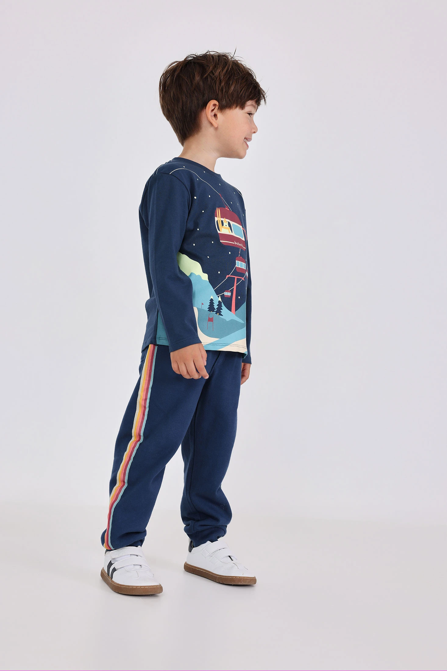 Pantalon en molleton pour garçon de couleur bleue avec bandes latérales, idéal pour les saisons d’automne et d’hiver. Fabriqué dans un tissu doux qui offre un grand confort, il dispose d'une taille élastique pour un ajustement parfait. Disponible en plusieurs tailles, il s'adapte au rythme actif des plus jeunes. Se marie facilement avec des t-shirts et des pulls, offrant une option polyvalente et élégante pour la garde-robe de votre enfant. Parfait pour garder votre fils au chaud et stylé en toute occasion.