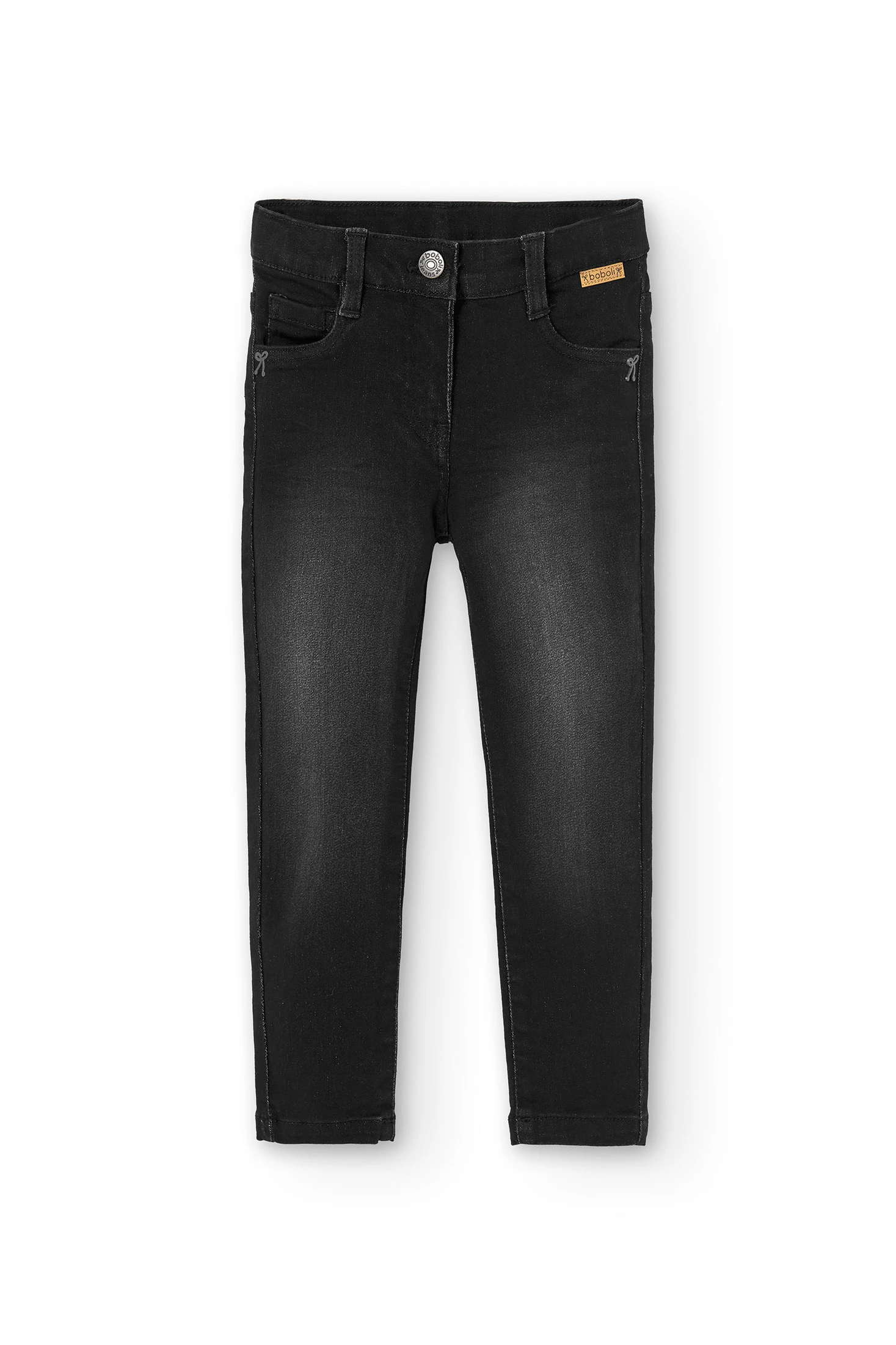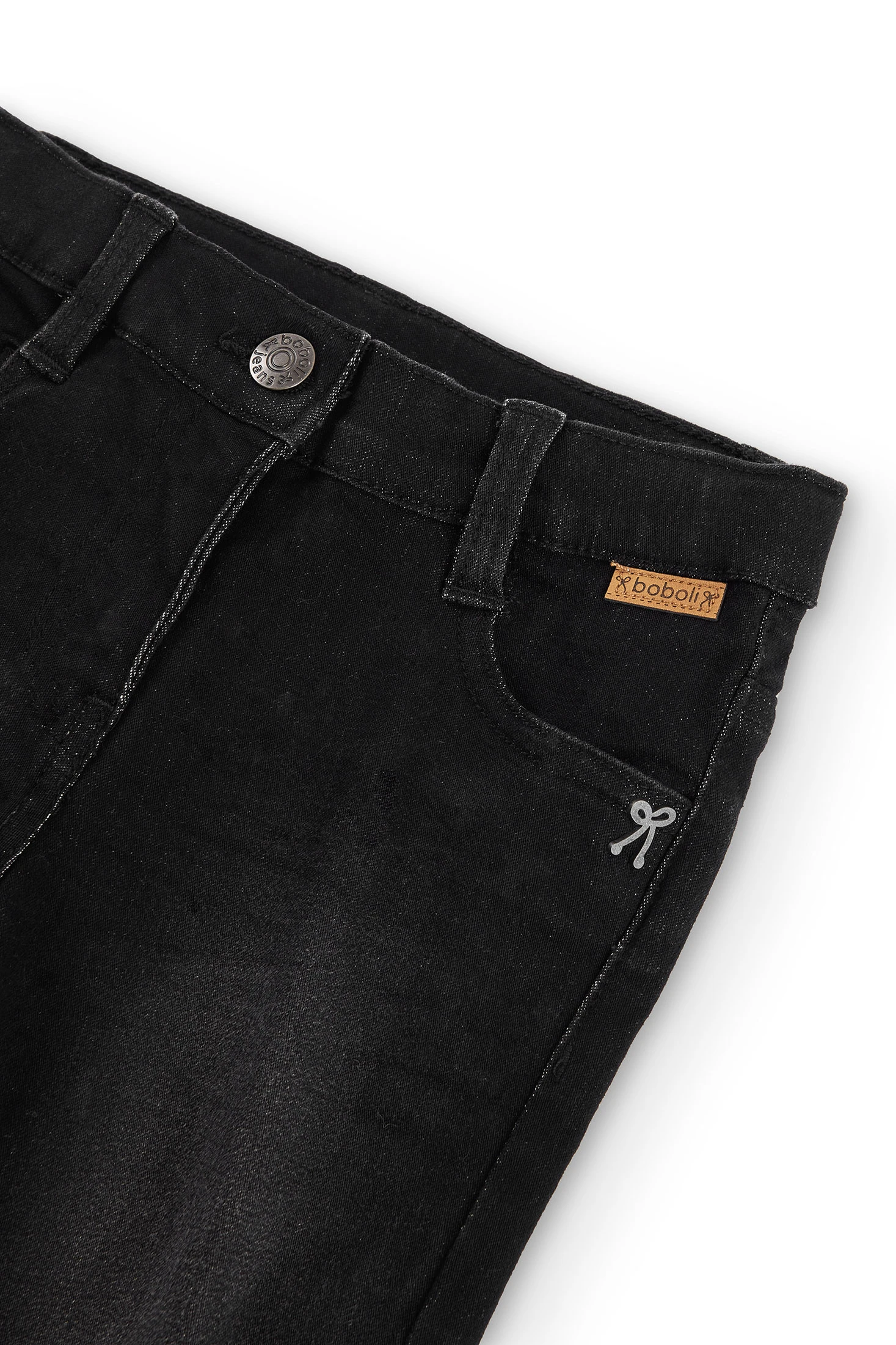 Pantalon en denim stretch noir pour fille, se ferme avec un bouton, la taille s'ajuste avec des oeillets élastiques et un bouton intérieur. La décoration est une étiquette avec les détails de la marque. Ce vêtement présente des détails usés qui lui donnent un aspect plus ancien. Disponible de la taille 4 ans à 16 ans