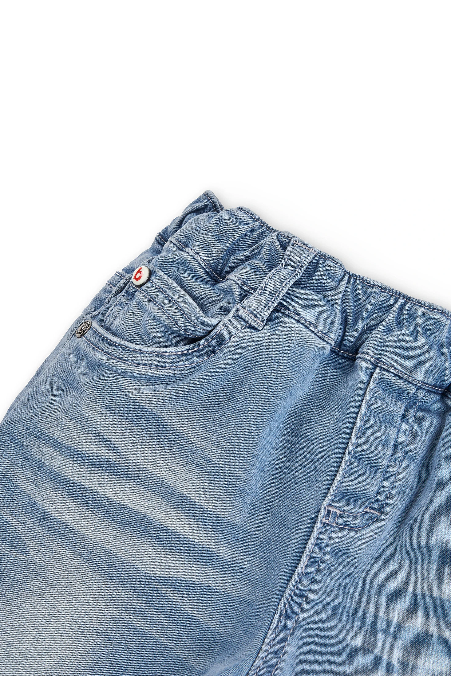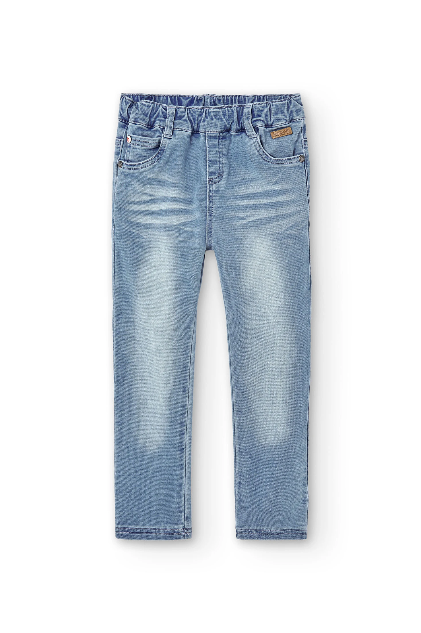 Jean en jersey stretch délavé pour garçon. Taille élastiquée. Décoré d’une étiquette au logo de la marque. Un procédé de finition donne au vêtement un aspect usé. Tailles disponibles de 4 à 16 ans.